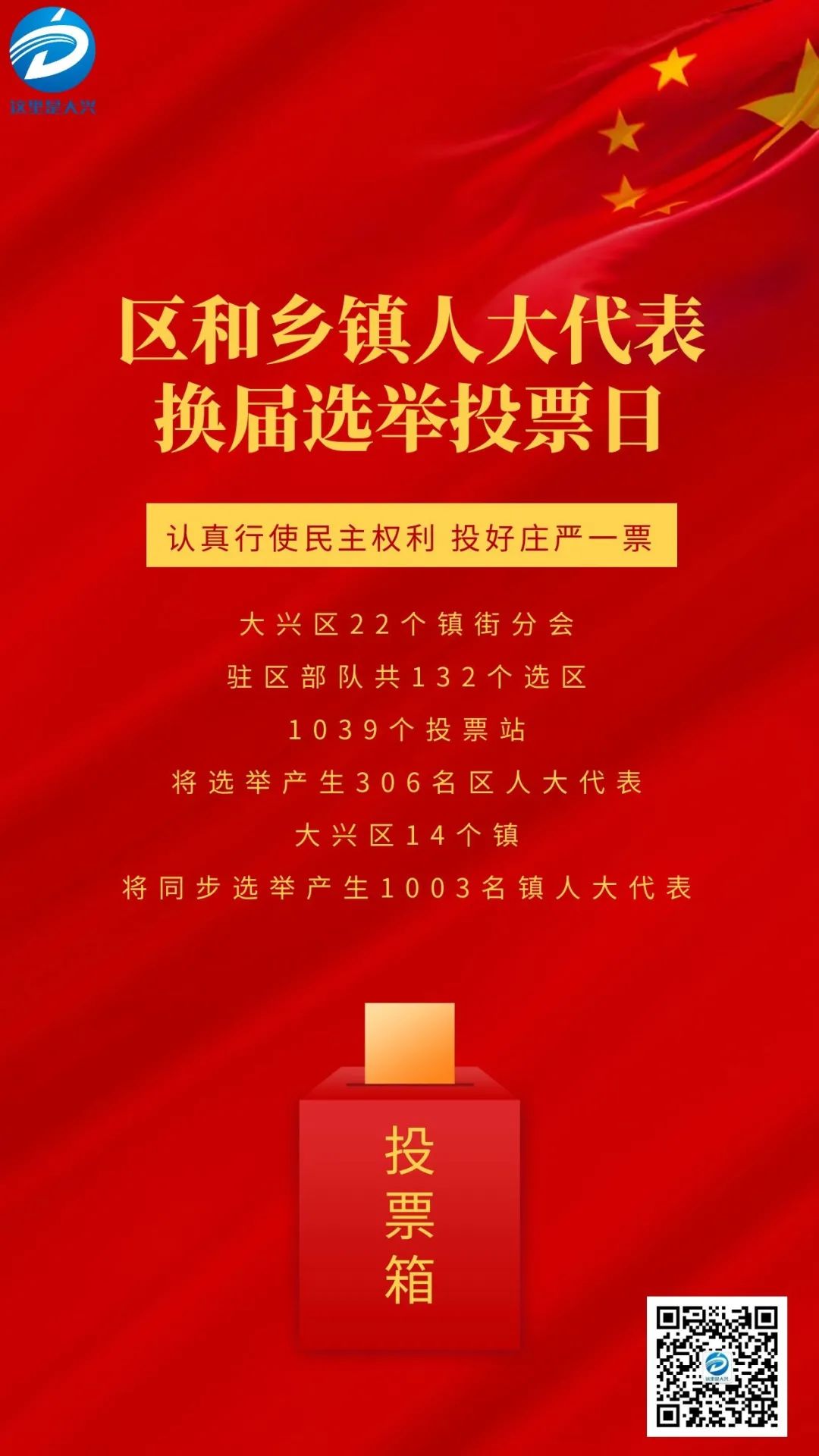 今天是区和乡镇人大代表换届选举投票日,大兴区22个镇街分会,驻区部队共132个选区,1039个投票站将选举产生306名区人大代表。