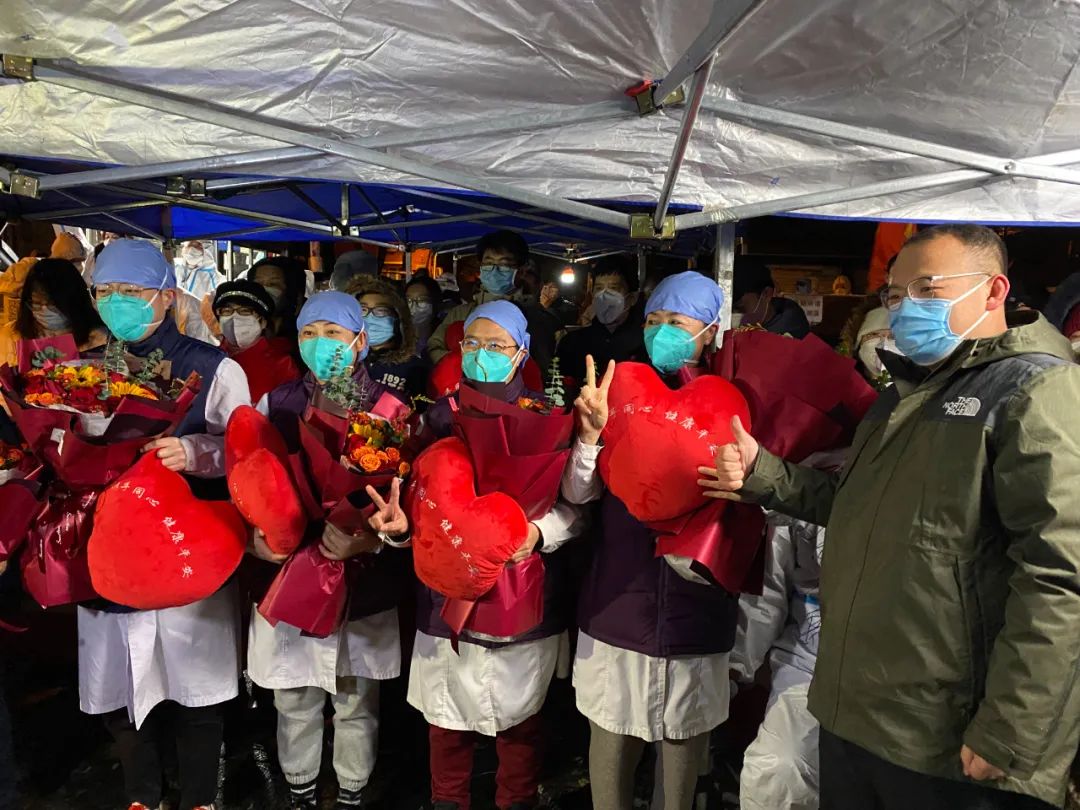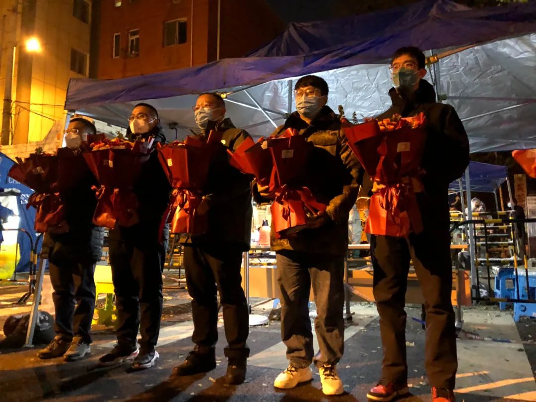 5位街道的干部拿来鲜花,送给驻守在这里的医护人员。