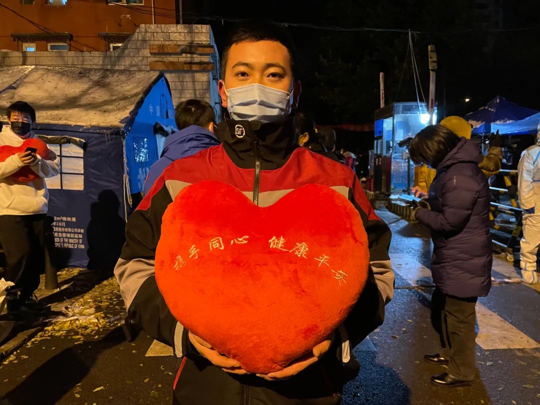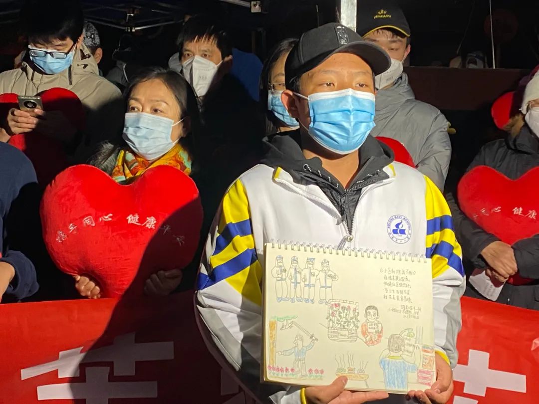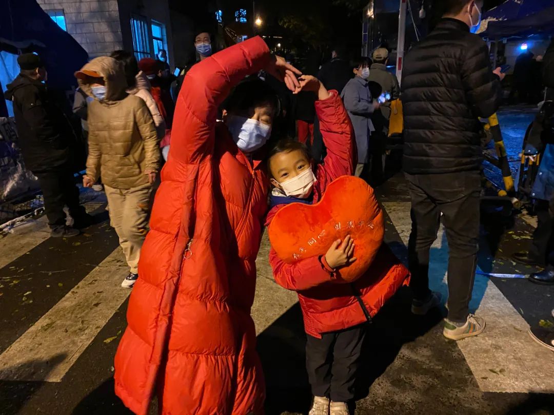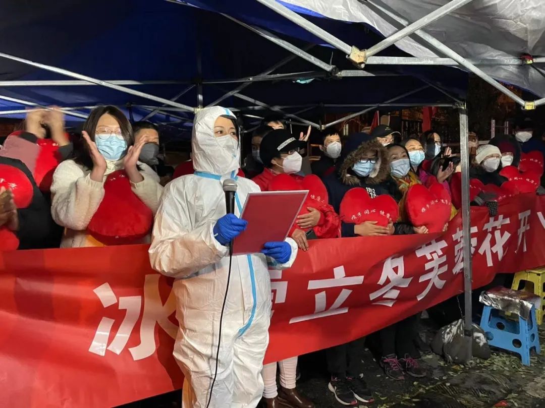 居民们手捧海淀街道准备的心形抱枕、条幅“守望相助共克时艰,冰雪立冬芙蓉花开”,边唱歌边走出社区,他们开心地鼓掌庆祝。解封现场“变身”一场大合唱,居民们的声音越来越大,连同路过的行人,见状也停下脚步,加入这场大合唱。