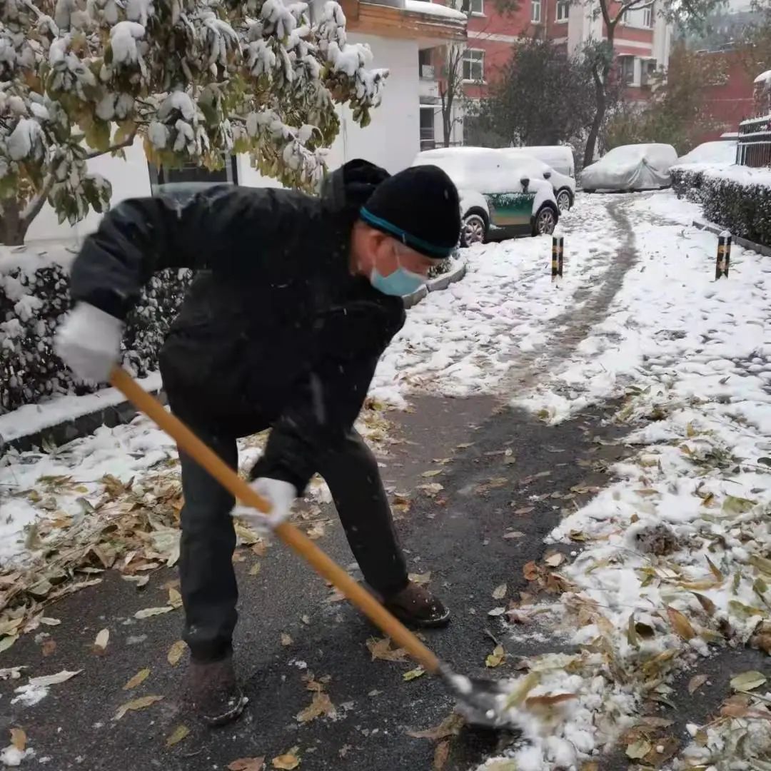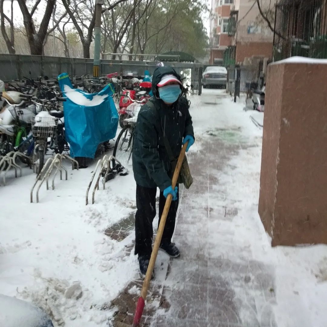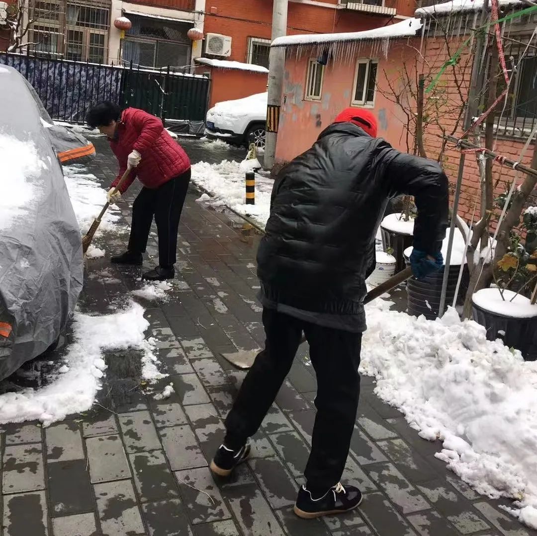 持续了夜的大雪将三里屯幸福二村社区装点得银装素裹,雪给大家带来了惊喜,也带来了出行的不便。为了保障社区居民的出行安全,幸福二村第一党支部楼院居民李金全清晨6点左右就主动清扫起甬道路面积雪,他默默的付出吸引来众多志愿者的加入,大家不畏寒冷、有序分工、配合默契,迅速将社区路面积雪清扫干净,并贴心的保留了公园的景观雪景,真正做到了精细化扫雪铲冰。