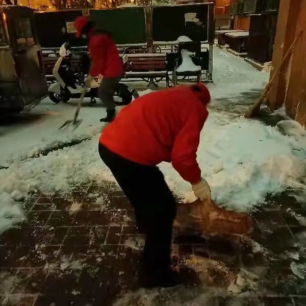 中纺里社区的党员志愿者们“以雪为令”热情高涨,干劲十足,不顾天气寒冷,路面湿滑,拿着扫帚、铁锹等工具,齐心协力清扫社区道路内的积雪,为社区居民的安全出行保驾护航。