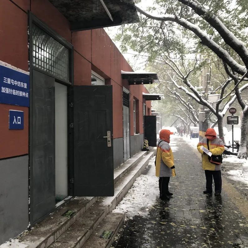 为应对寒潮雨雪天气,三里屯地区两个疫苗接种点提早作出工作安排,加强组织协调,保障人员力量。7日一早已完成各疫苗接种点周边扫雪铲冰工作,确保雨雪天气接种不间断;并充分考虑天气情况,优化接种流程、开启接种点采暖设备,降低接种人员的等候时间,提高留观区域环境条件。