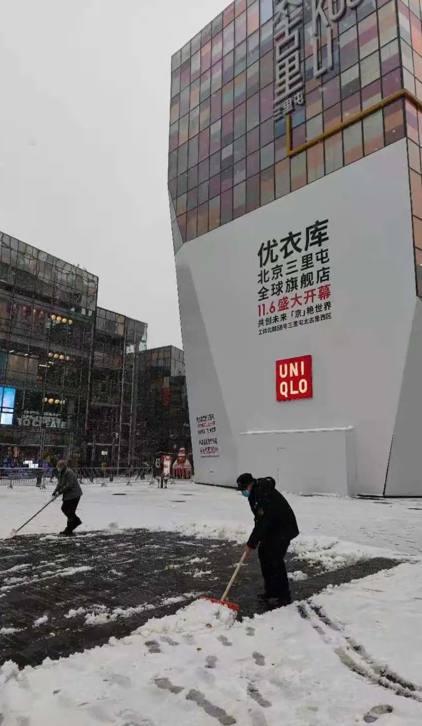 大雪纷飞的三里屯很美,在这里不仅有冬日的阳光将温暖播撒在大地,每一片雪花背后也有一些温暖的人,在担心着你的出行安全。