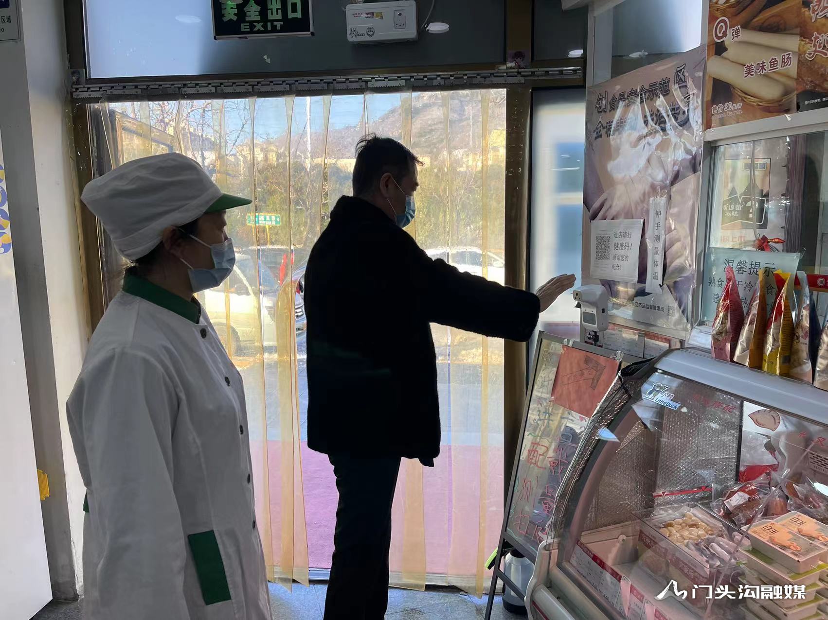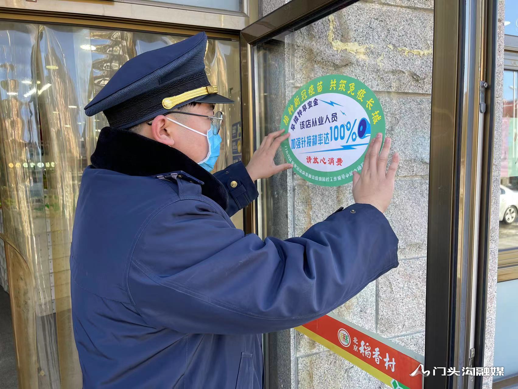 记者跟随门头沟区市场监管局执法人员到龙门地区,对沿街商户进行走访检查,重点查看各商户疫情防控措施落实情况,并仔细核对员工新冠疫苗加强针接种情况,对接种率达100%的商户,执法人员会为其张贴印有“该店从业人员加强针接种率达100%”字样的“放心消费贴”,让市民购物消费更加放心。