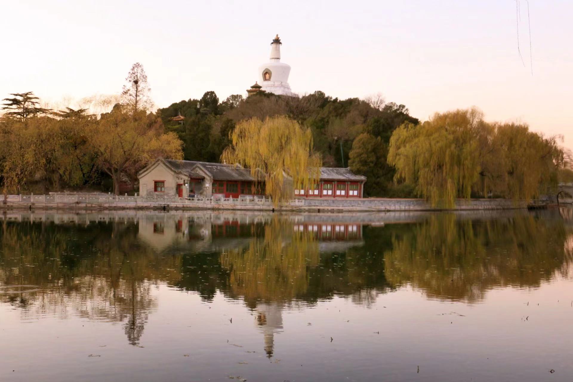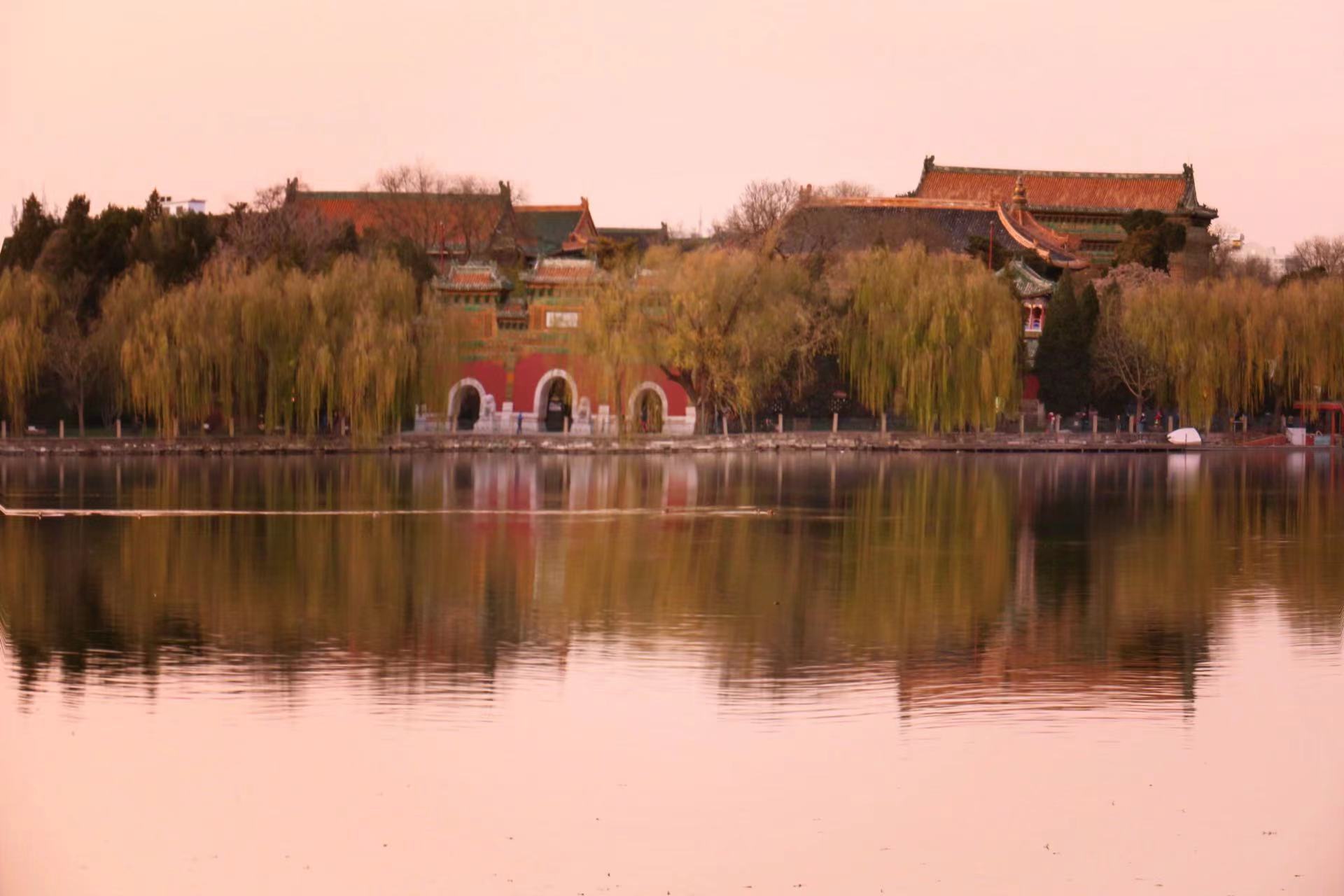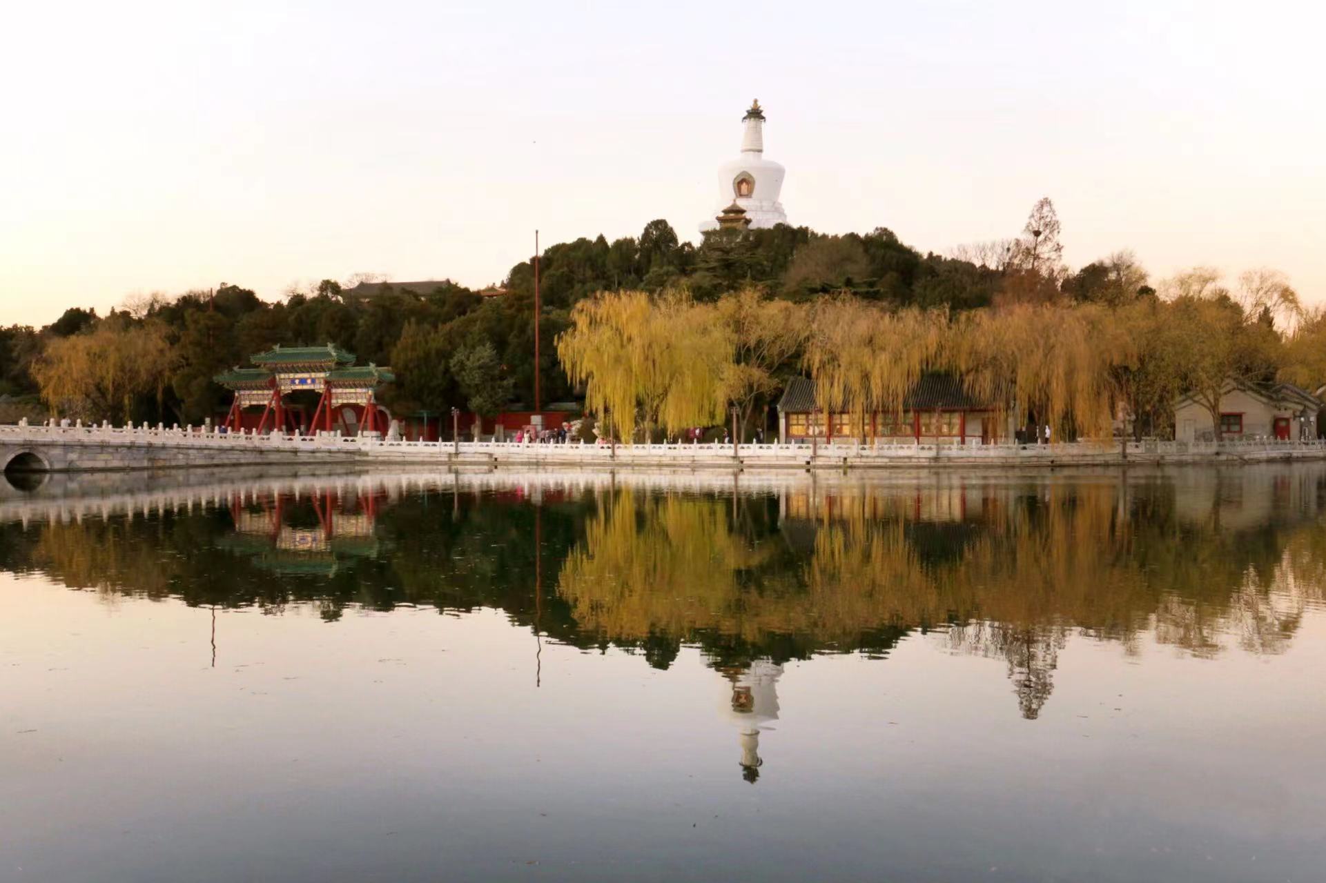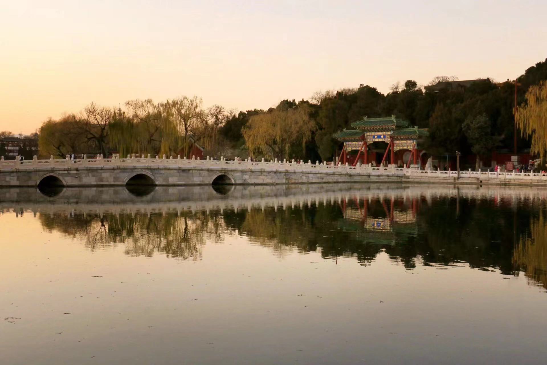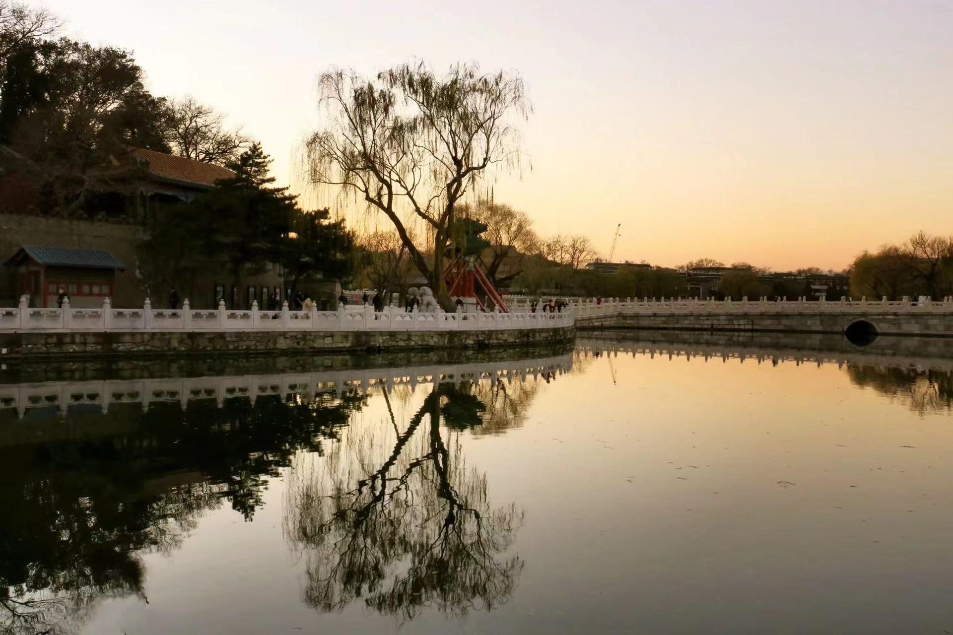 冬日,北海公园漂浮着静谧的气息。白塔的倒影落入清晰如镜的湖面中,诉说着远离喧嚣的祥和。夕阳下,天边被涂上一层火红,岸边的红墙在落日余晖的映衬下,低诉着历史的年轮。红墙黛瓦与白塔,在此刻形成了一幅优美的画卷。
