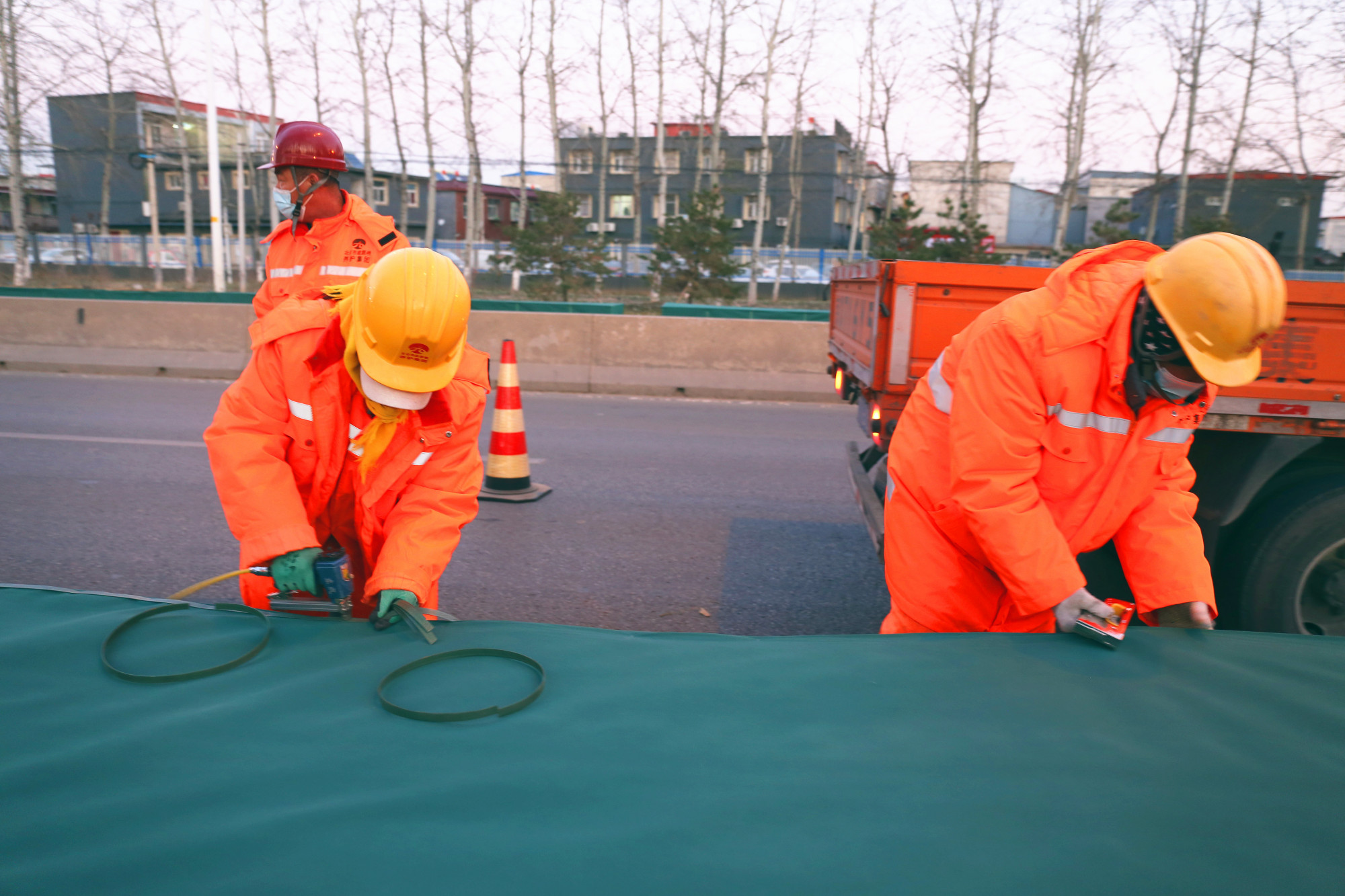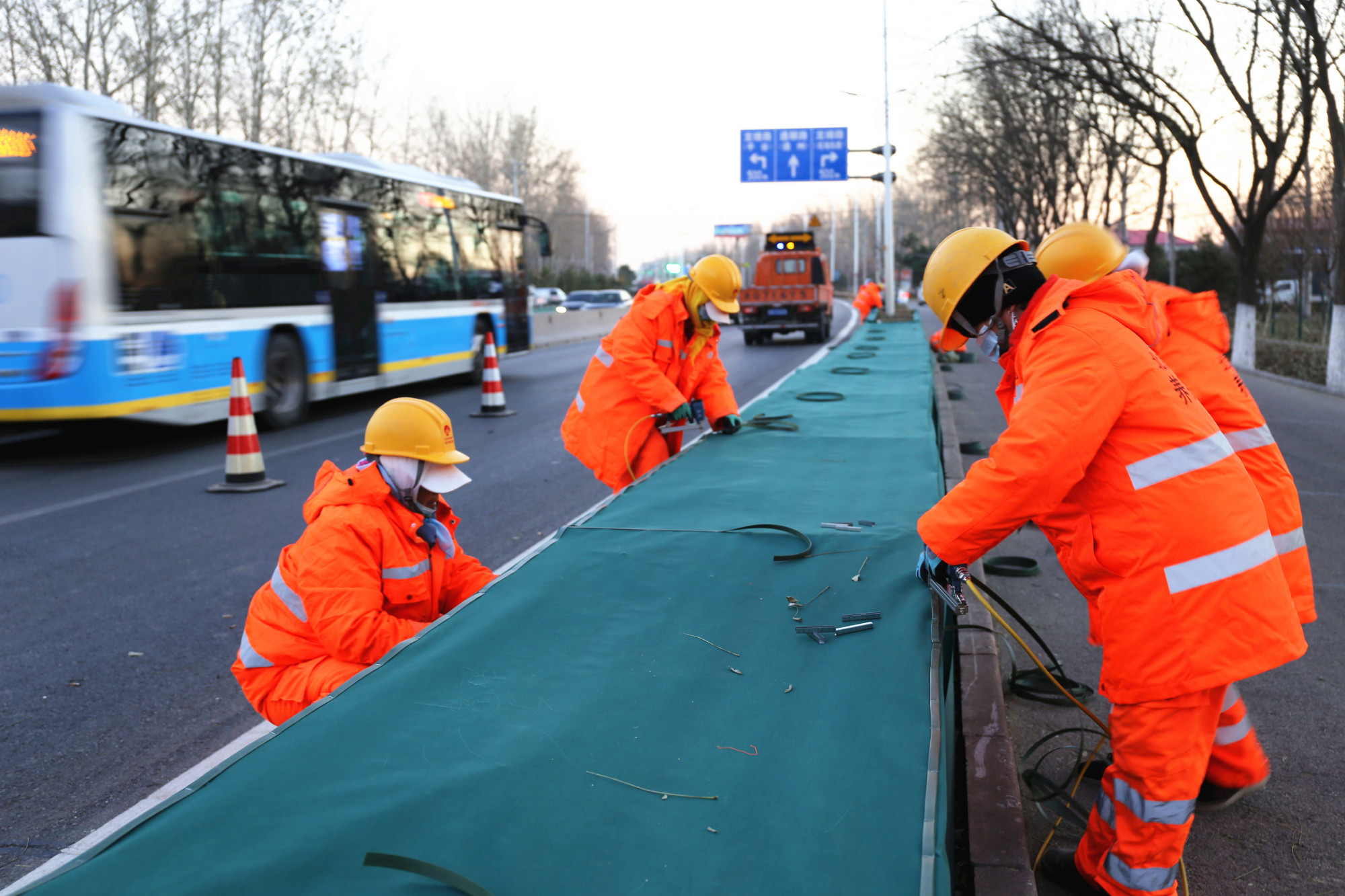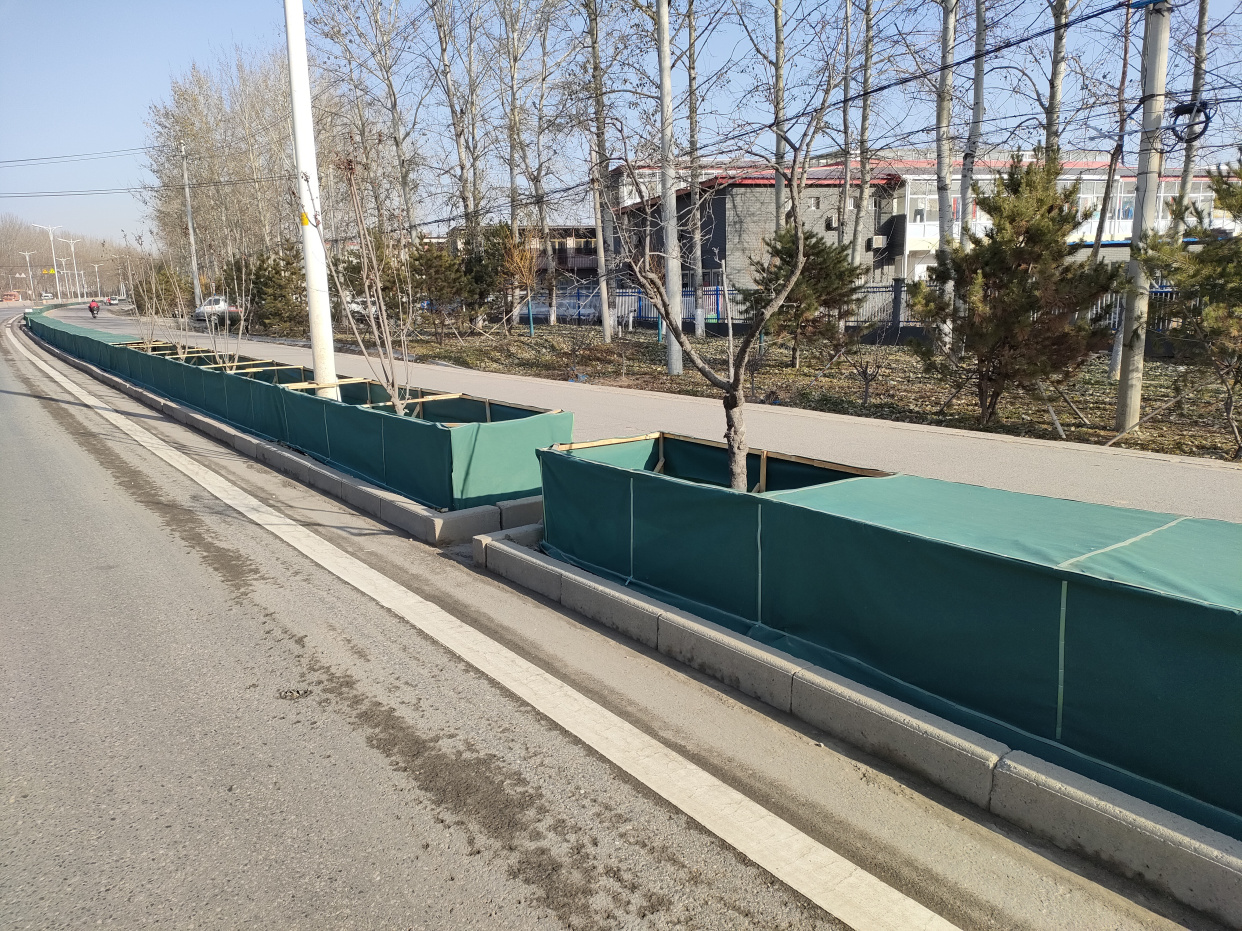 防寒防盐工作主要通过裹防水无纺布、缠草绳、搭风障、埋土、浇灌上冻水等方法,切实做好植物防寒保暖措施,提高植物抗冻、抗旱能力。同时,风障能有效避免含融雪剂的雪水喷溅或堆积在绿化带内,最大限度避免融雪剂对绿化植物的腐蚀。本次防寒防盐工作预计12月初完成,届时全区37条公路上的5000余株乔木、13.5万余株灌木、47.1万平方米色带将全部穿上防寒防盐“冬衣”,暖暖过冬。