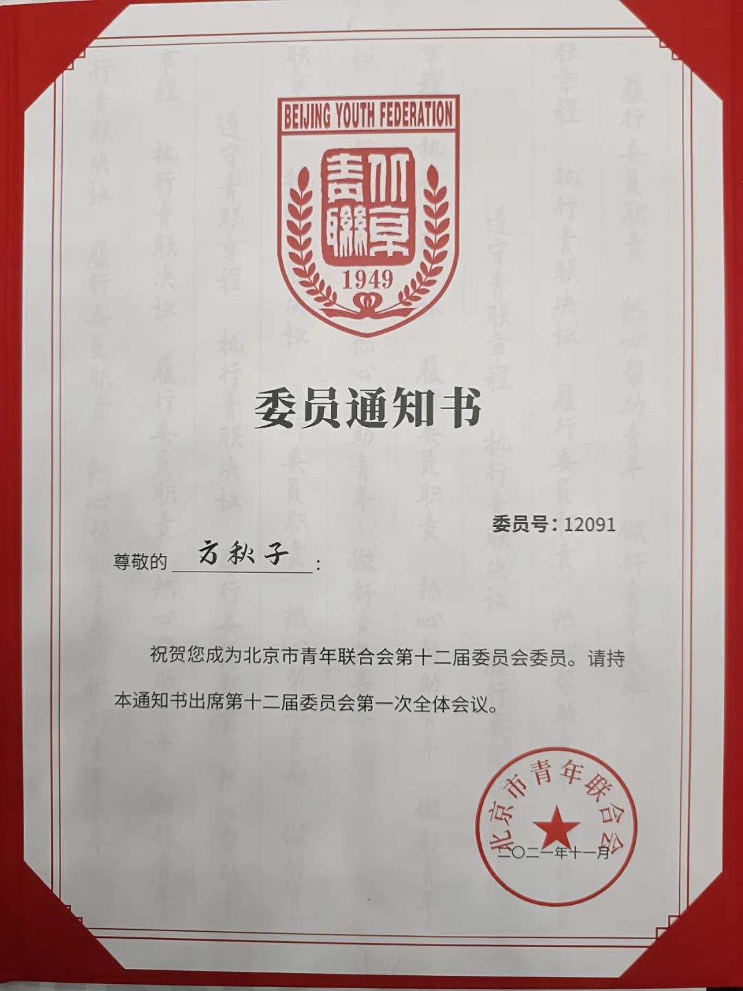 11月26日,北京市青年联合会十二届一次全会、北京市学生联合会第十三次代表大会开幕。京沈分公司“秋子服务”品牌带头人方秋子当选为第十二届北京市青联委员会常务委员会委员。