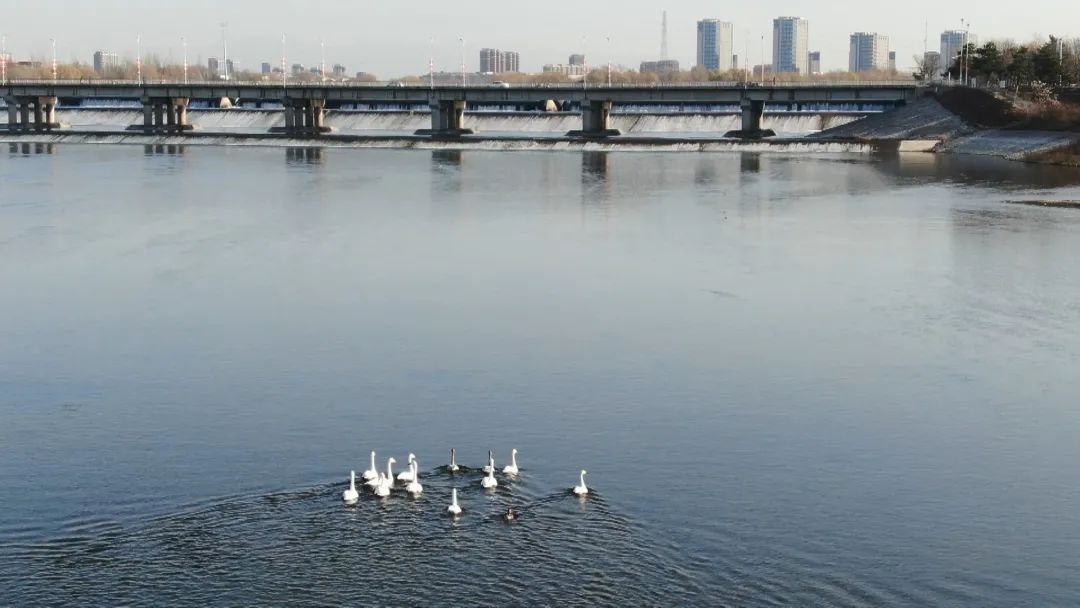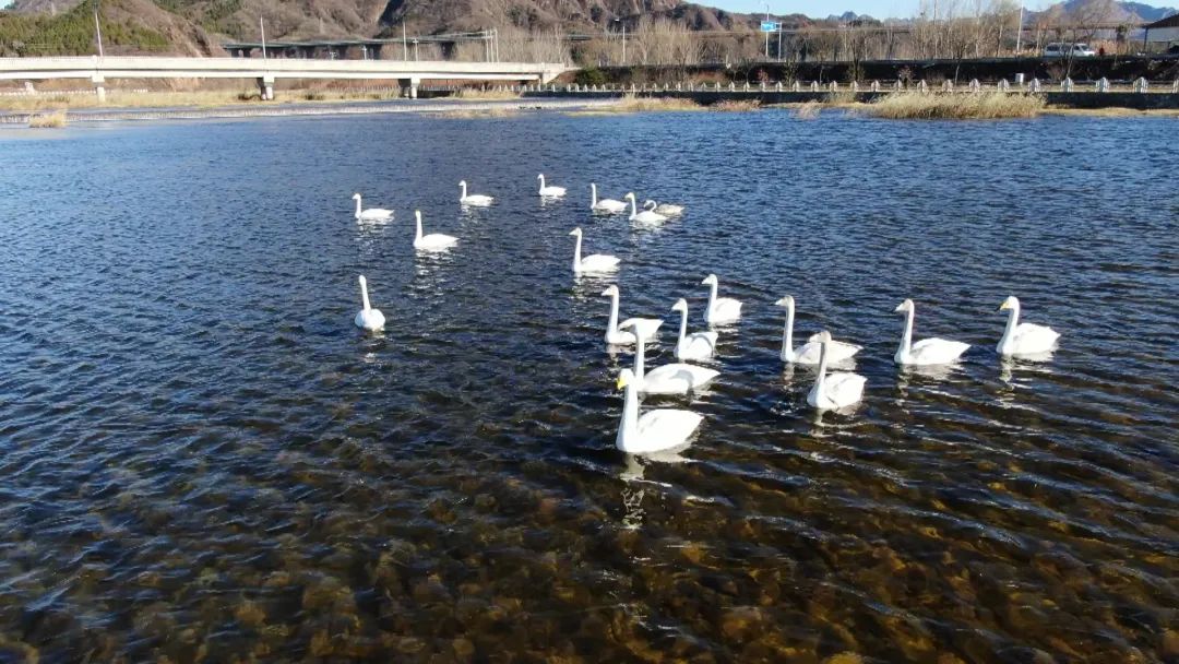 清水河中,一群大天鹅舒展着优雅的身姿正在清澈的河水中悠闲游弋;城区潮白河汇合口处,长期“定居”的野鸭与大天鹅结伴在水中嬉戏成趣,享受着冬日暖阳。