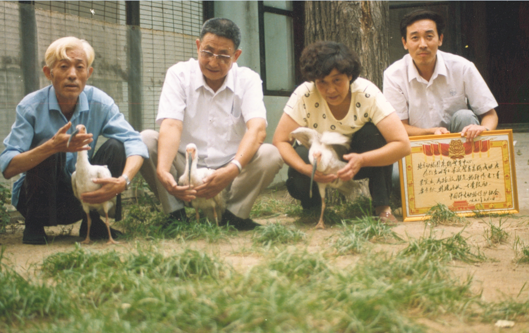 1986年,北京动物园成立了“朱鹮人工养殖中心”,由李福来先生负责,李福来是著名的朱鹮保护、繁殖专家,被北京市授予“有突出贡献的专家”称号。毛宇回忆“当时这边缺人手,我从孵化室调过来的,和同事一起跟着李福来老先生学习,我印象特别深第一天到班组,那时候老班长还是王淑琴,我就记得她脸上那大大的黑眼圈,印象很深”。