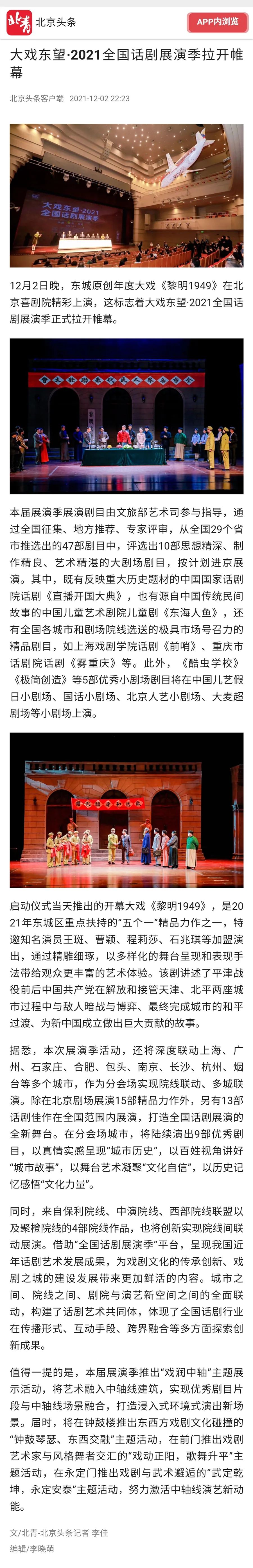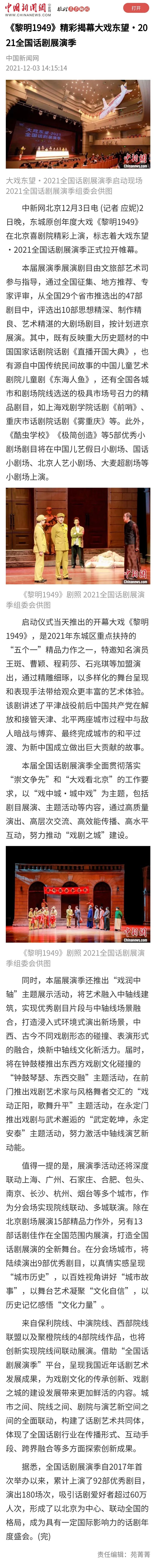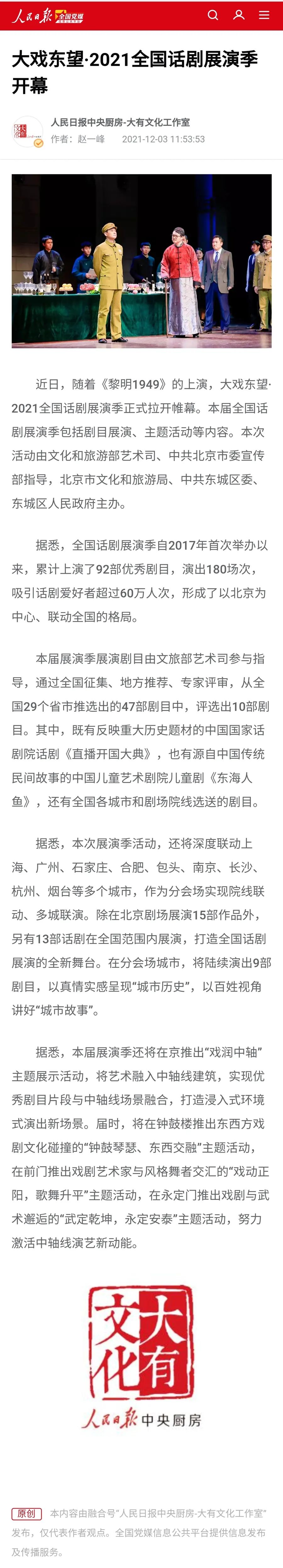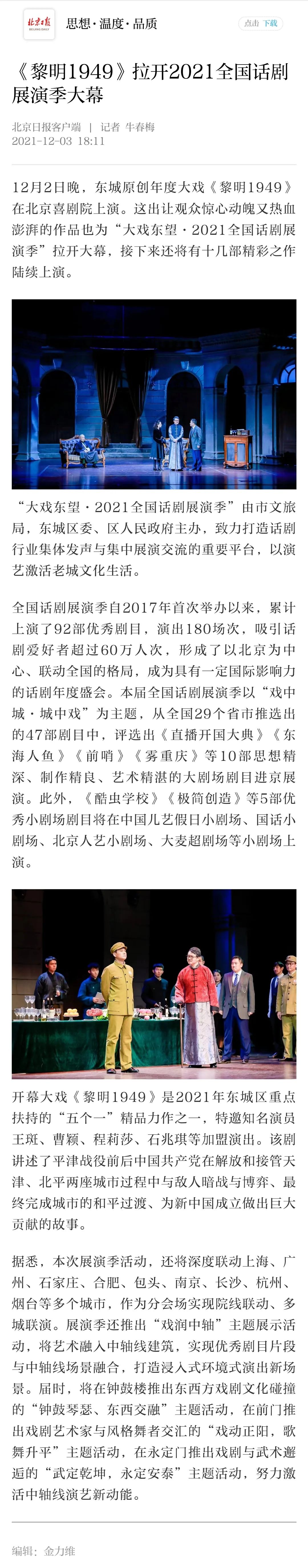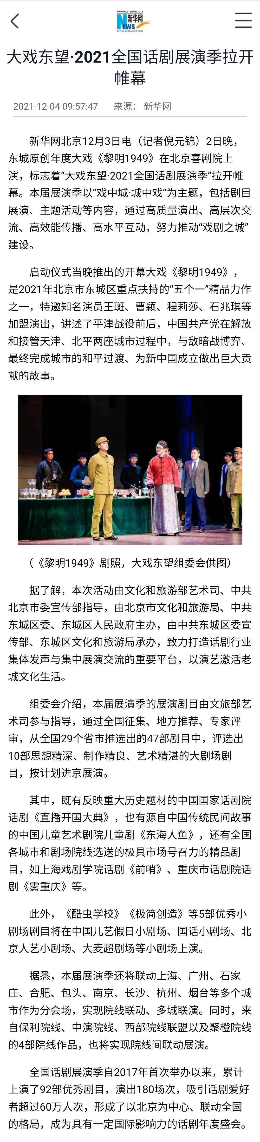 开幕式当晚,东城原创年度大戏《黎明1949》在北京喜剧院精彩上演,标志着大戏东望·2021全国话剧展演季正式拉开帷幕。