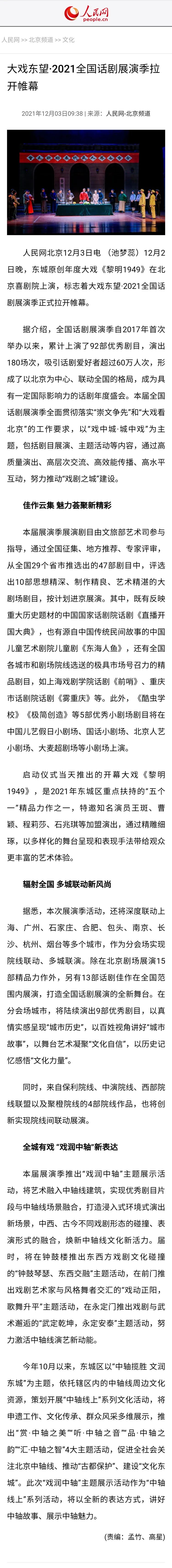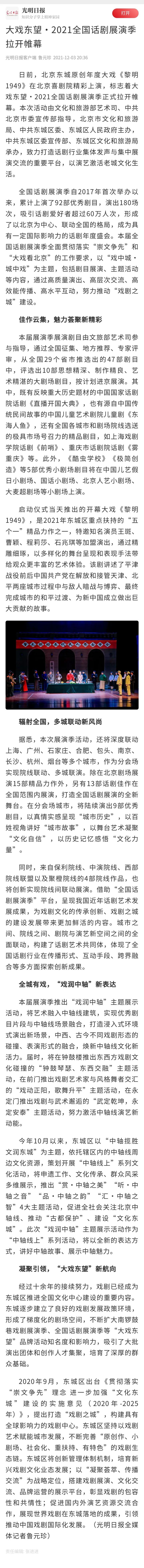 大戏东望·2021全国话剧展演季全面贯彻落实“崇文争先”和“大戏看北京”的工作要求,以“戏中城·城中戏”为主题,包括剧目展演、主题活动等内容,通过高质量演出、高层次交流、高效能传播、高水平互动,努力推动“戏剧之城。