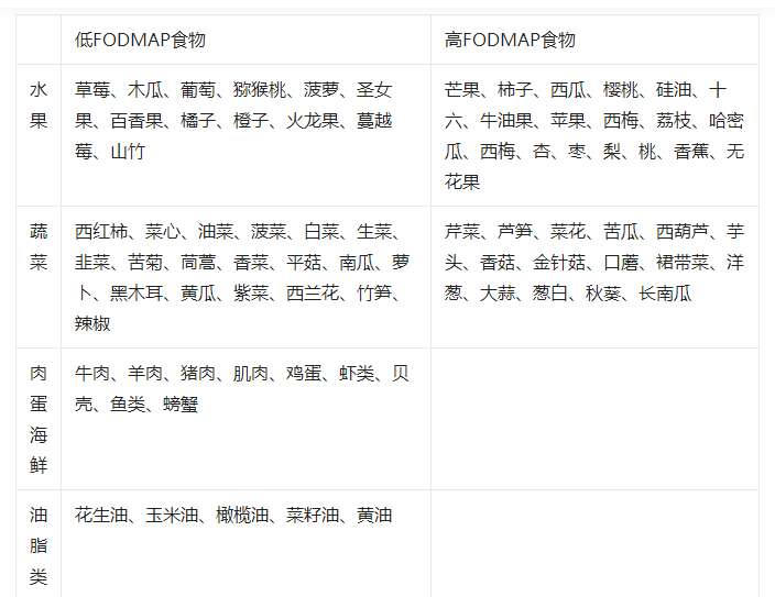 饮食因素可诱发或加重IBS症状,调节生活方式加强体育锻炼可使IBS患者受益。IBS症状的发生多与饮食不耐受有关,有研究提示,富含发酵性寡糖、双糖、单糖和多元醇(FODMAP)的食物在小肠内难以吸收,可使肠腔渗透压升高,并在结肠中发酵产生气体,而引起或加重腹痛、腹胀、腹部不适等症状。调整饮食结构,实行低FODMAP饮食有助于缓解这类症状。
