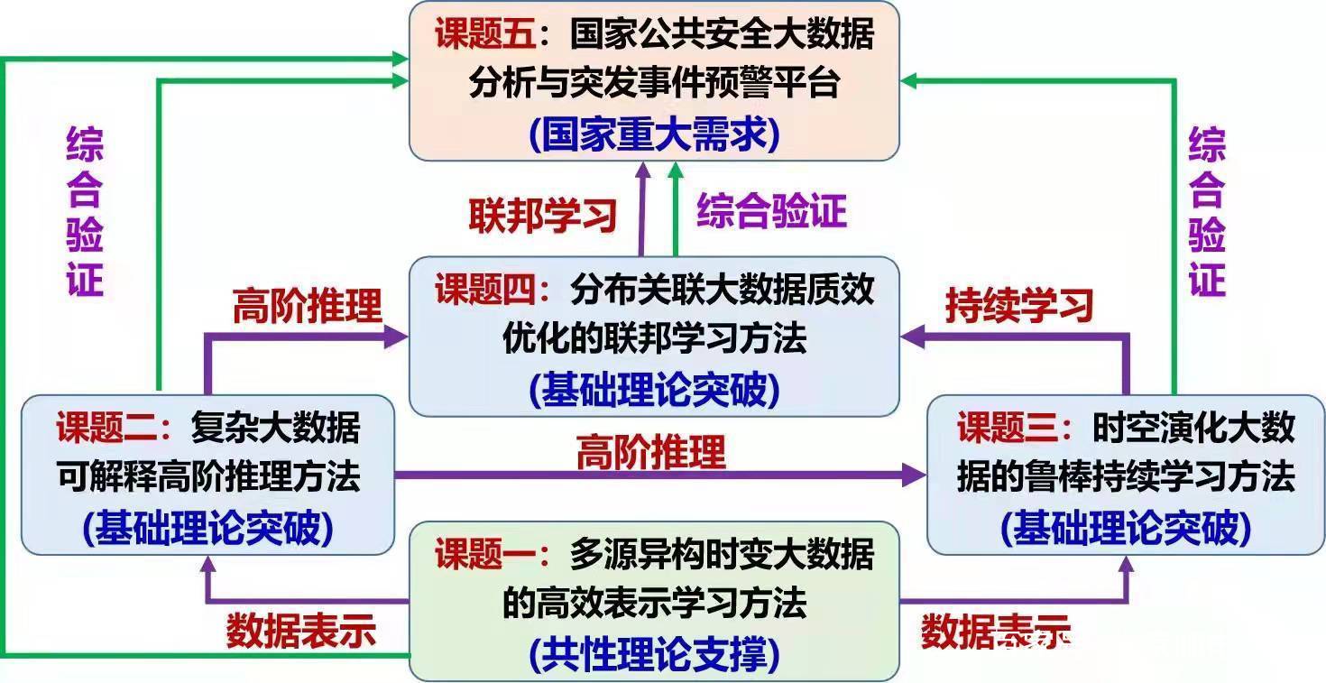 该项目由我校杜军平教授主持,设有5个课题,分别由杜军平教授、西安交通大学郑庆华教授、中国科学院自动化研究所胡卫明研究员、南京大学高阳教授和国家计算机网络与信息安全管理中心李扬曦副处长承担。该项目针对复杂大数据如何转化为知识体系的科学问题,开展复杂大数据高效学习基础理论与关键技术研究,建立多源异构时变大数据的表示模型,提出复杂大数据可解释高阶推理、时空演化大数据的鲁棒持续学习、分布关联大数据质效优化的联邦学习等模型与方法,旨在解决多源、异质、时变、隐匿大数据高效学习面临的表示模型学习效率低、推理过程黑箱难解释、持续学习鲁棒能力弱和联邦学习质效均衡难等瓶颈问题,并初步建立公共安全大数据分析与突发事件预警平台,在突发事件发现、刻画、态势预测等方面达到国际领先水平,实现公共安全突发事件的早发现、早定位、早预警、早处置,为及时有效地处置公共安全突发事件提供理论与技术支持。