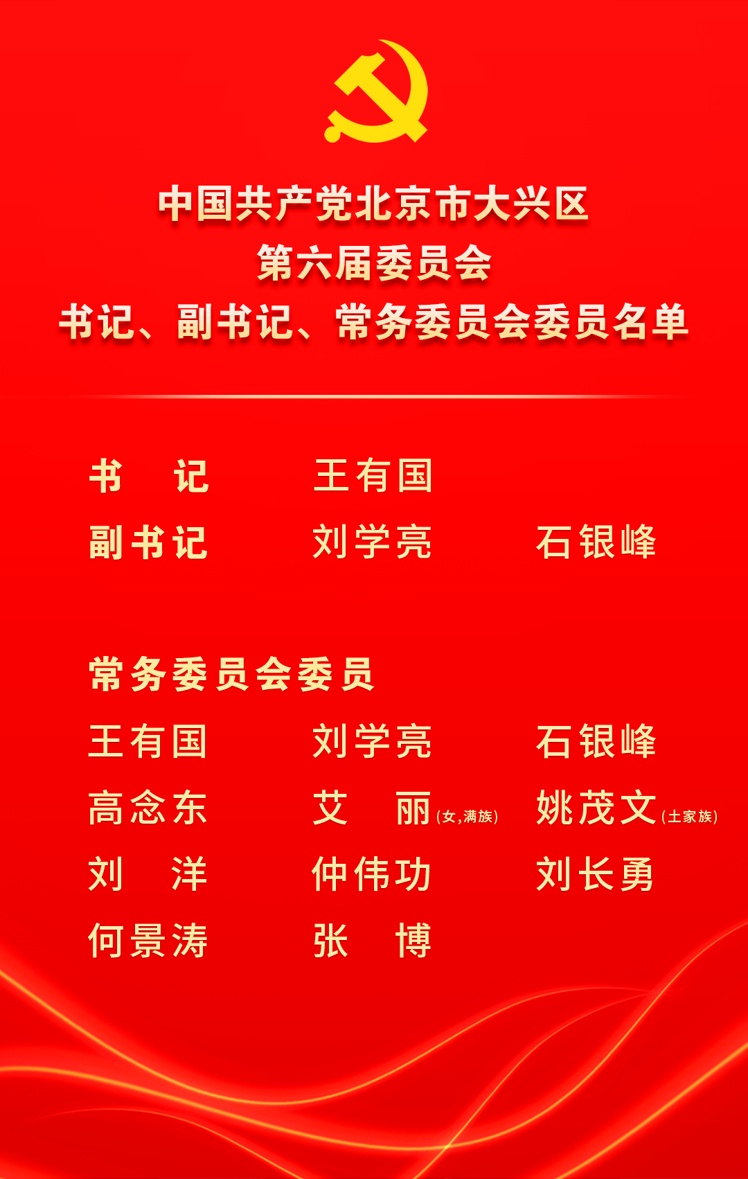 12月10日下午,中国共产党北京市大兴区第六届委员会召开第一次全体会议。王有国当选为区委书记,刘学亮、石银峰为区委副书记。