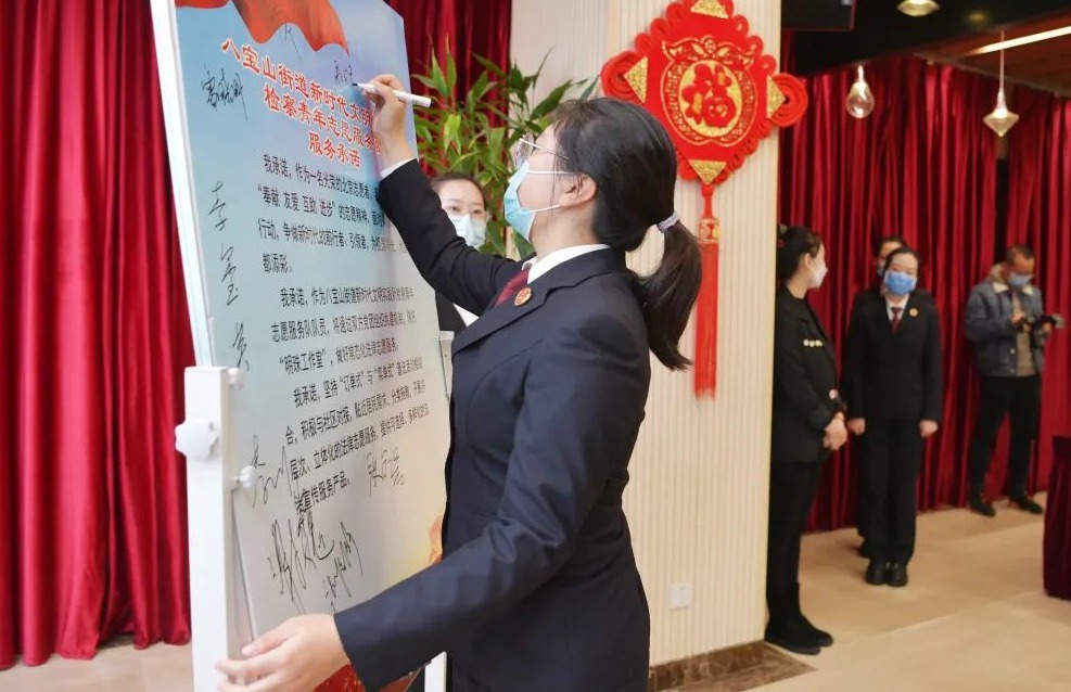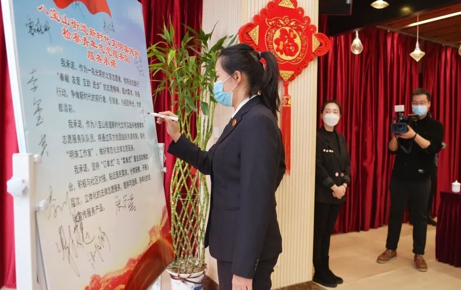 ▲图为市检一分院“明珠工作室”主持人车明珠、八宝山街道新时代文明实践所代表发言,检察青年志愿者签署服务承诺