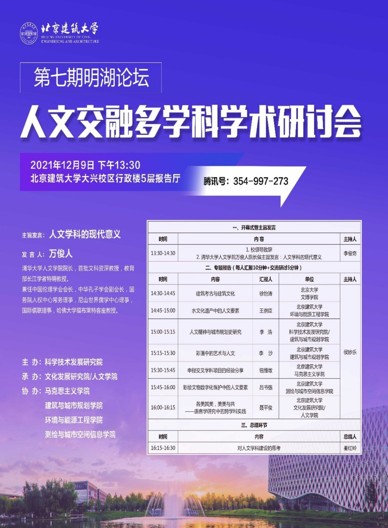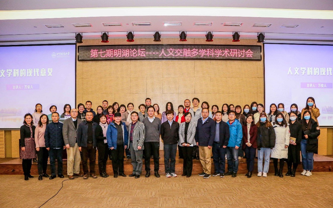 12月9日下午,以“人文学科建设”为主题的第七期明湖论坛在大兴校区建本报告厅成功举办。本次论坛由我校科学技术发展研究院主办,文化发展研究院/人文学院承办,马克思主义学院、建筑与城市规划学院、环境与能源工程学院、测绘与城市空间信息学院协办。党委常委、副校长李俊奇,党委常委孙景仙、党委常委孙冬梅,科学技术发展研究院、文发院/人文学院、马克思主义学院主要负责人,各学院老师和同学们共100余人通过线上和线下的方式参加了此次论坛。本次论坛邀请了清华大学人文学院院长万俊人教授和北京大学考古与文博学院徐怡涛教授参加。论坛主旨发言环节由我校文发院/人文学院院长秦红岭教授主持。