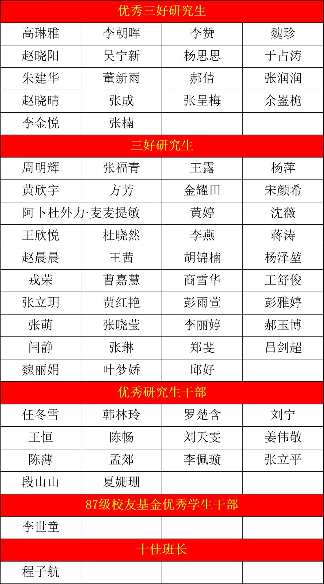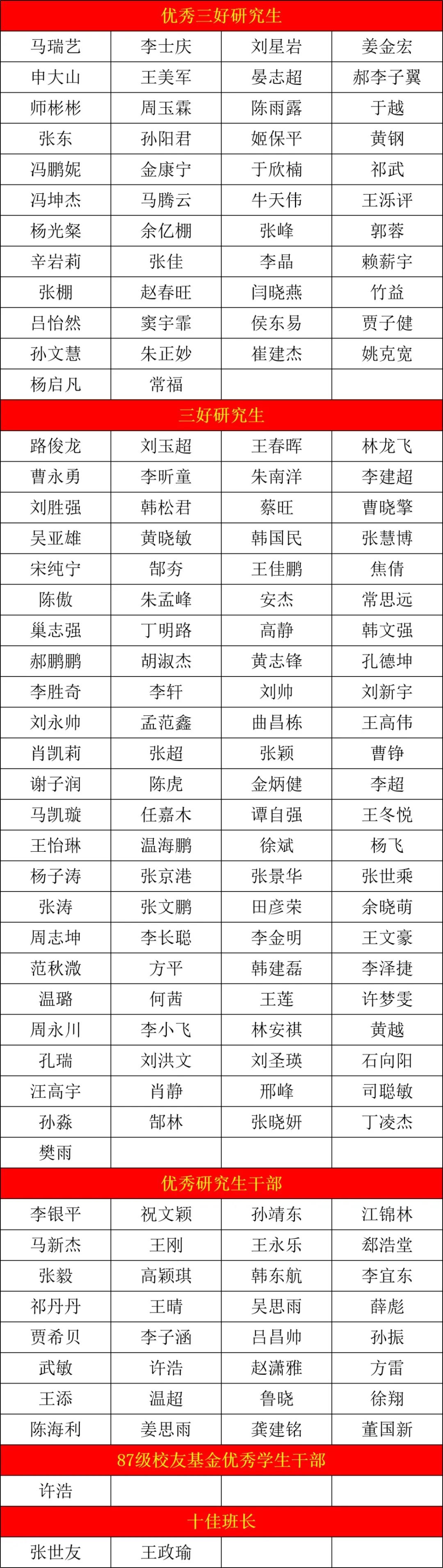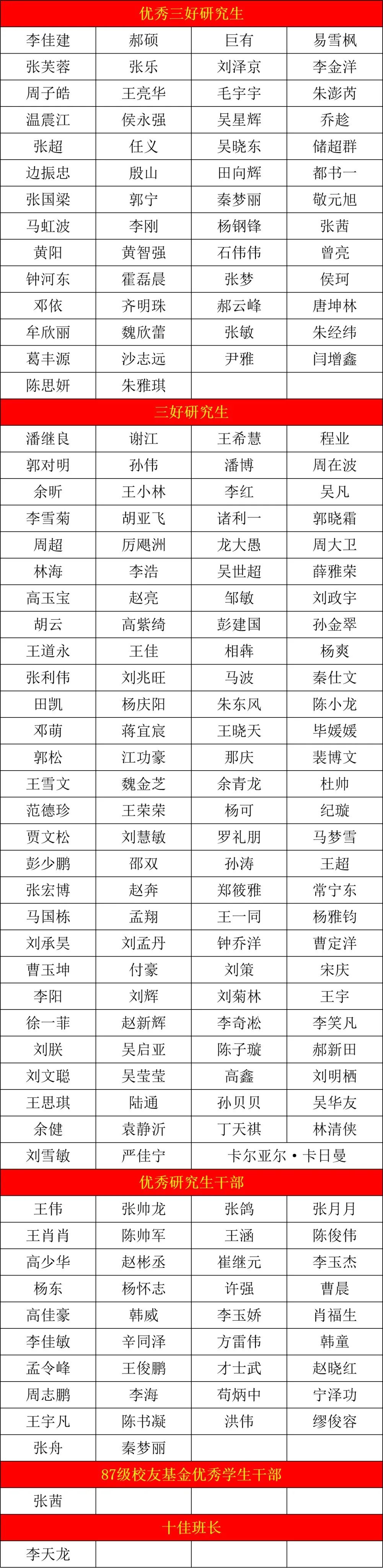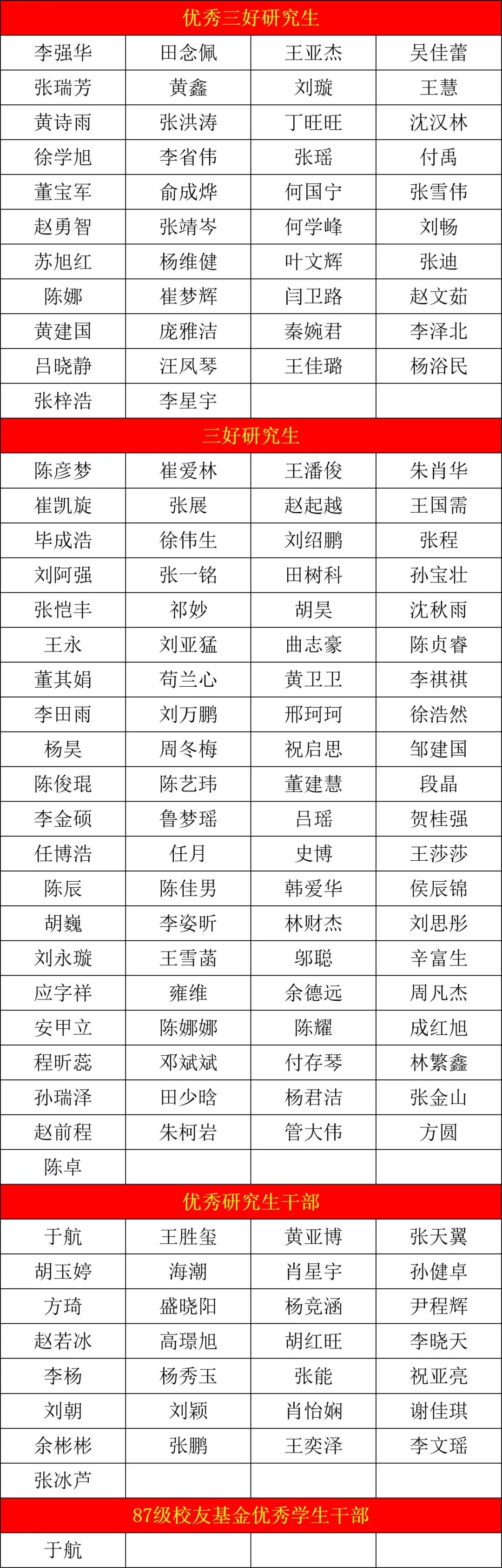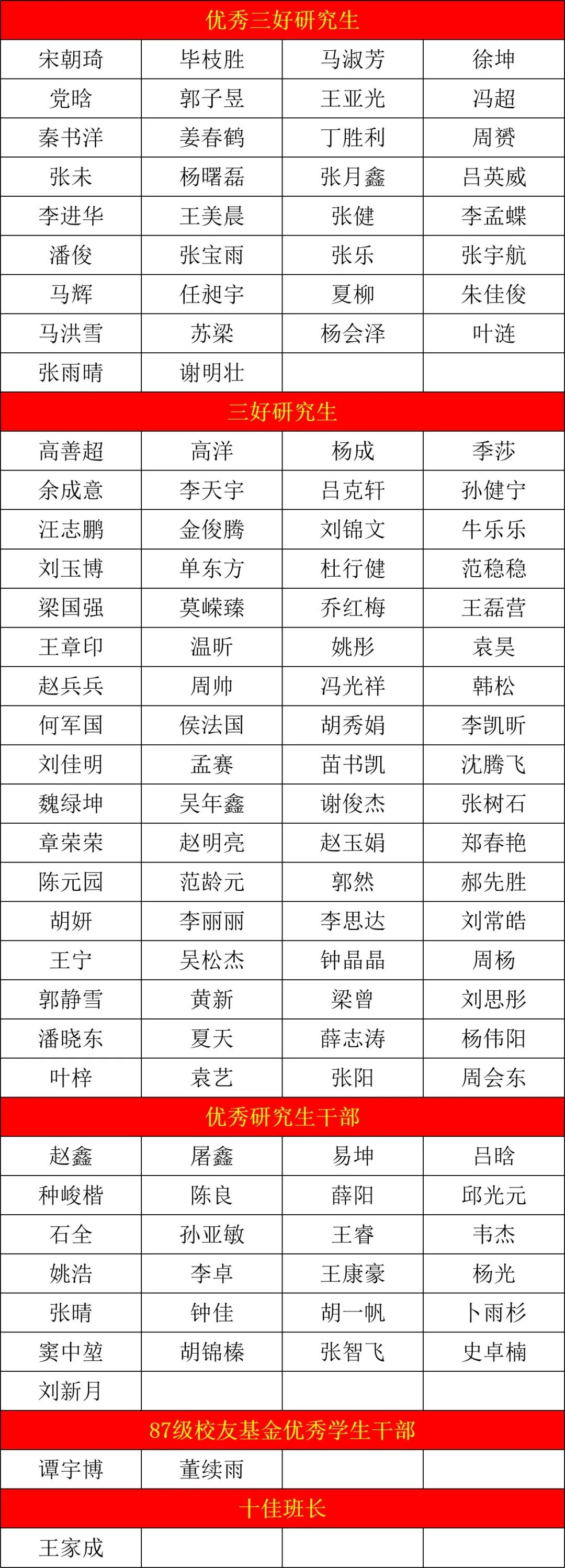 经学生申请,学院、培养单位推荐,学校学生评比表彰工作领导小组审定并公示,2020-2021学年本科生优秀三好学生、三好学生、优秀学生干部、优秀三好研究生、三好研究生、优秀研究生干部、87级校友基金优秀学生干部、十佳班长的评选工作已经完成,获得荣誉称号的学生共4313名。其中,本科生优秀三好学生524名,三好学生1051名,优秀学生干部666名,优秀三好研究生548名(含研究生国家奖学金获得者171名、十佳学术之星及提名奖获得者7名),三好研究生1110名,优秀研究生干部384名,87级校友基金优秀学生干部20名,十佳班长10名。