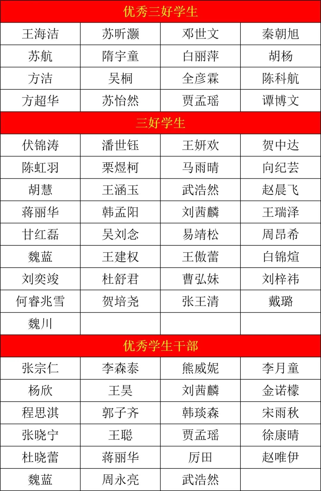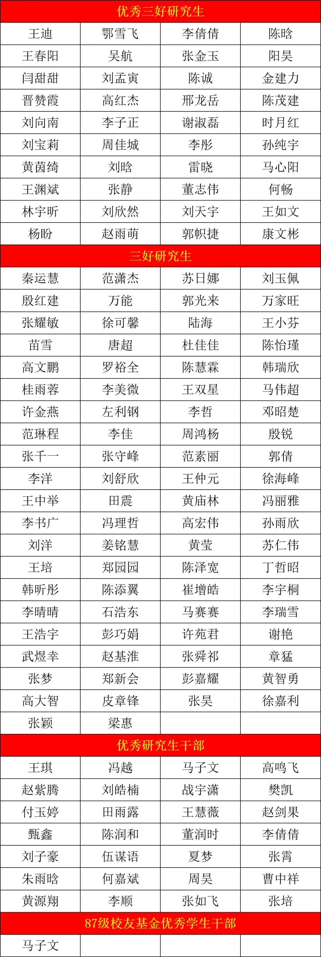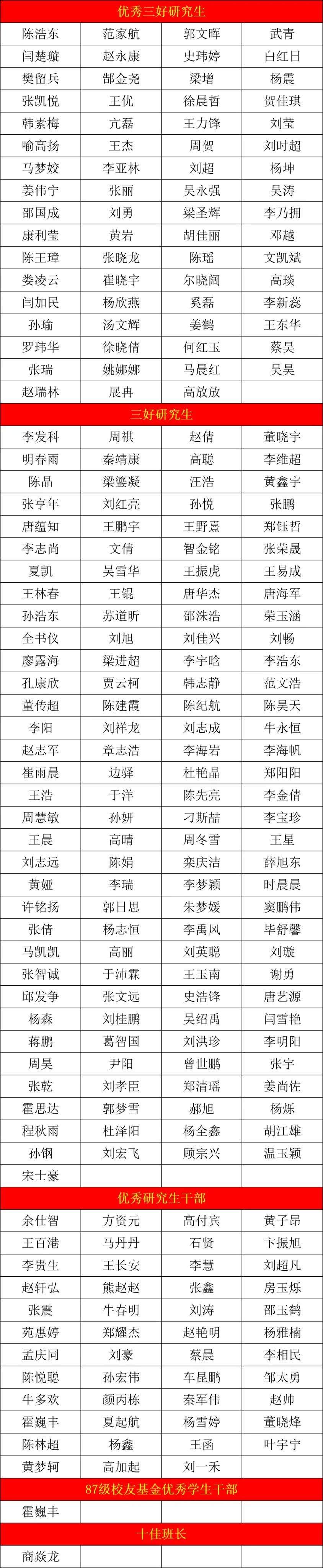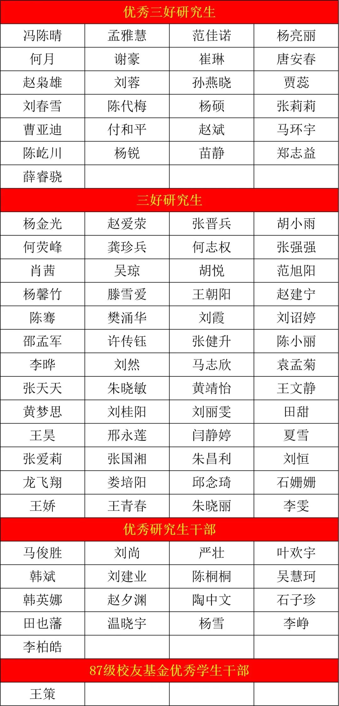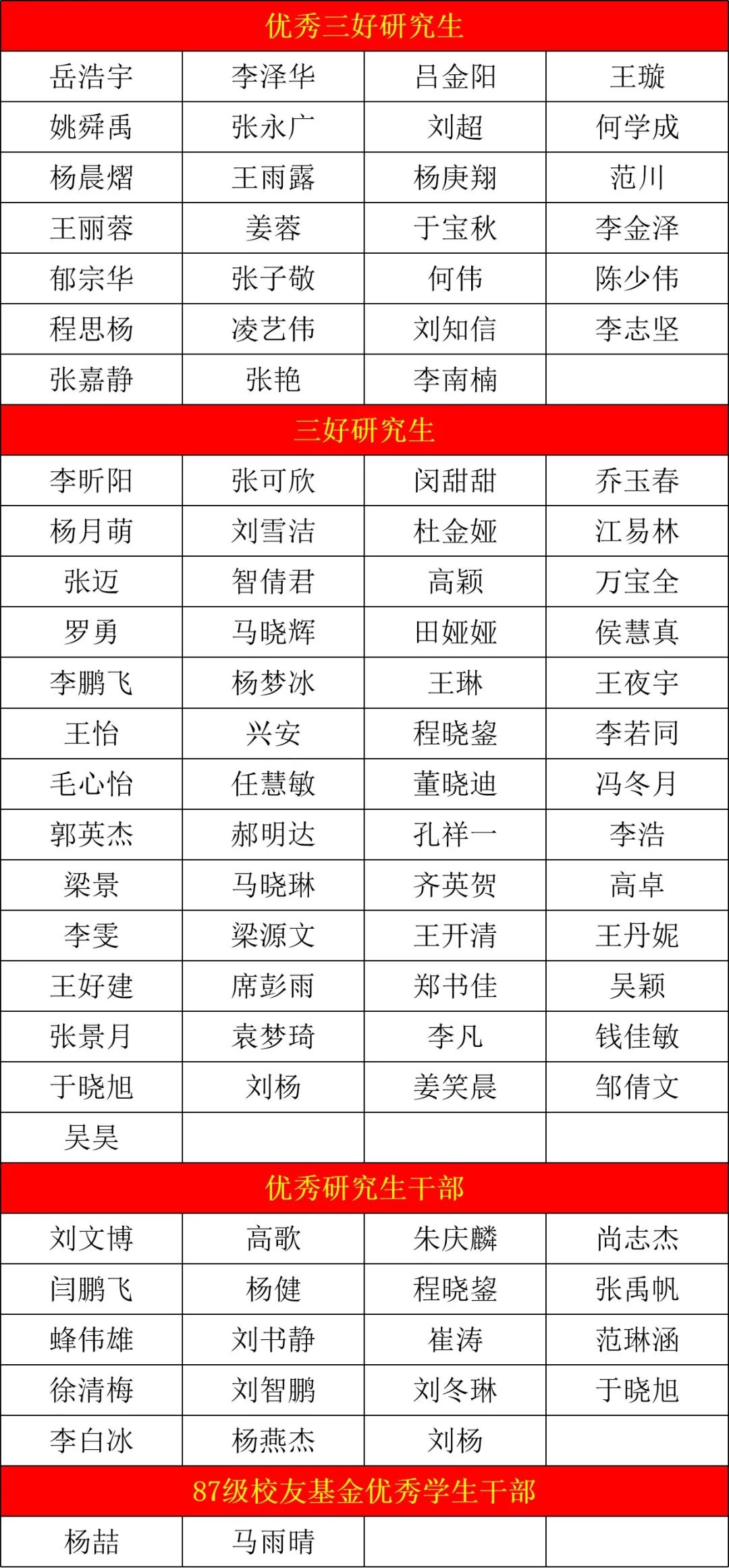 经学生申请,学院、培养单位推荐,学校学生评比表彰工作领导小组审定并公示,2020-2021学年本科生优秀三好学生、三好学生、优秀学生干部、优秀三好研究生、三好研究生、优秀研究生干部、87级校友基金优秀学生干部、十佳班长的评选工作已经完成,获得荣誉称号的学生共4313名。其中,本科生优秀三好学生524名,三好学生1051名,优秀学生干部666名,优秀三好研究生548名(含研究生国家奖学金获得者171名、十佳学术之星及提名奖获得者7名),三好研究生1110名,优秀研究生干部384名,87级校友基金优秀学生干部20名,十佳班长10名。