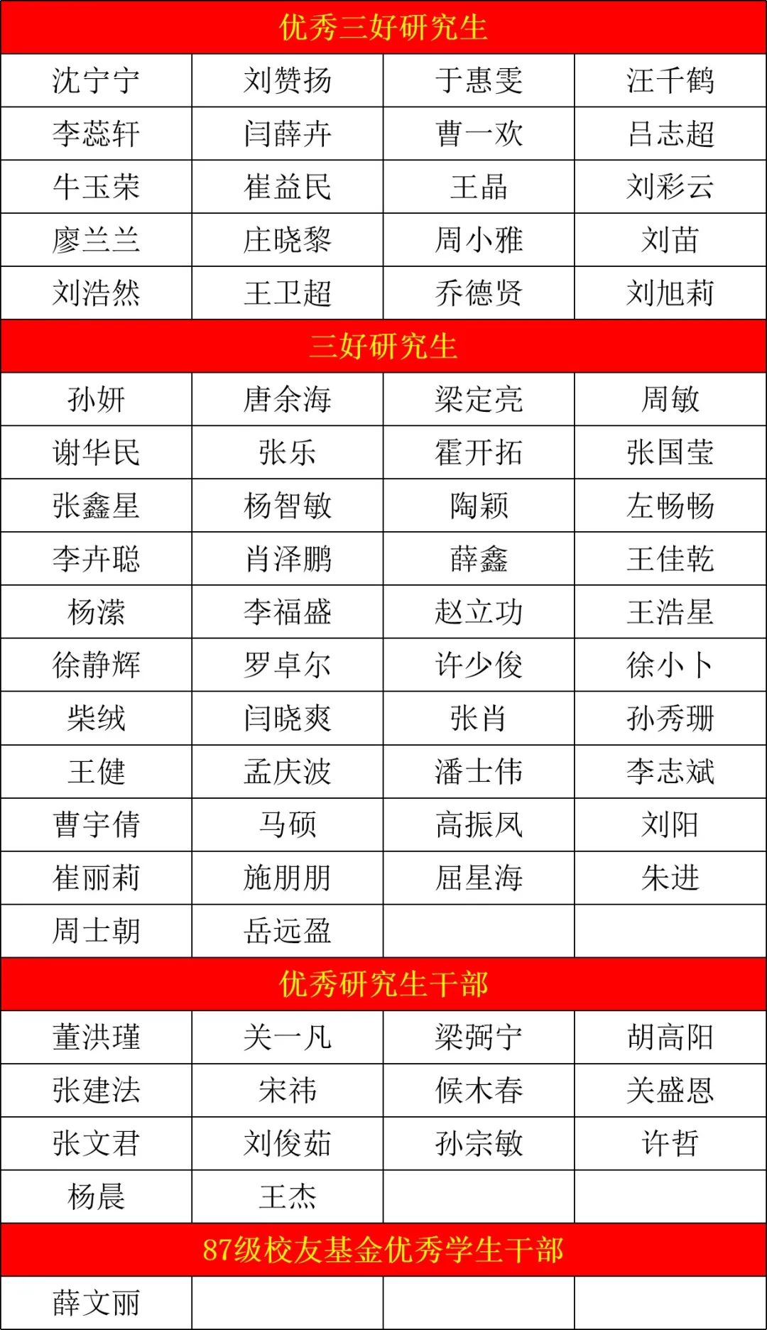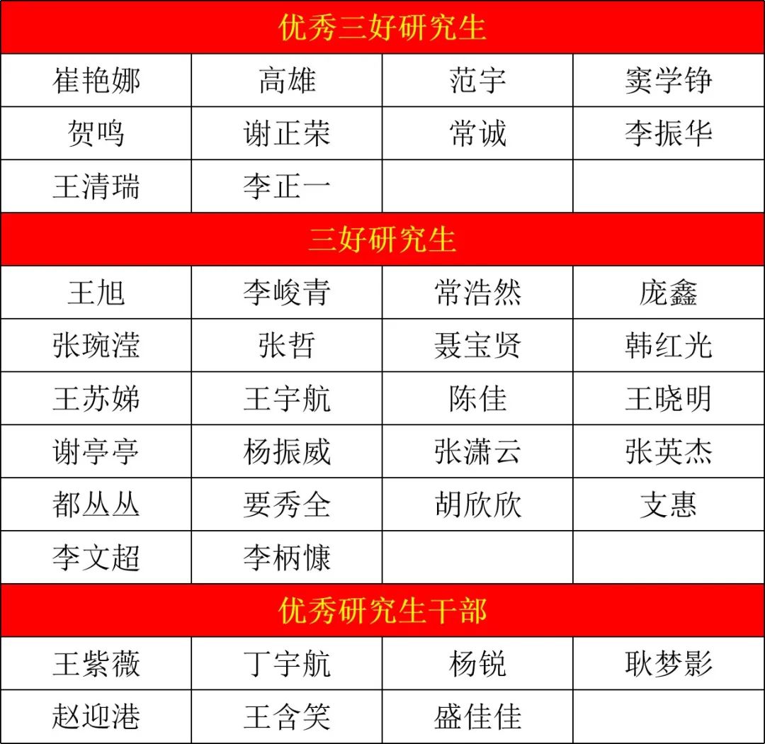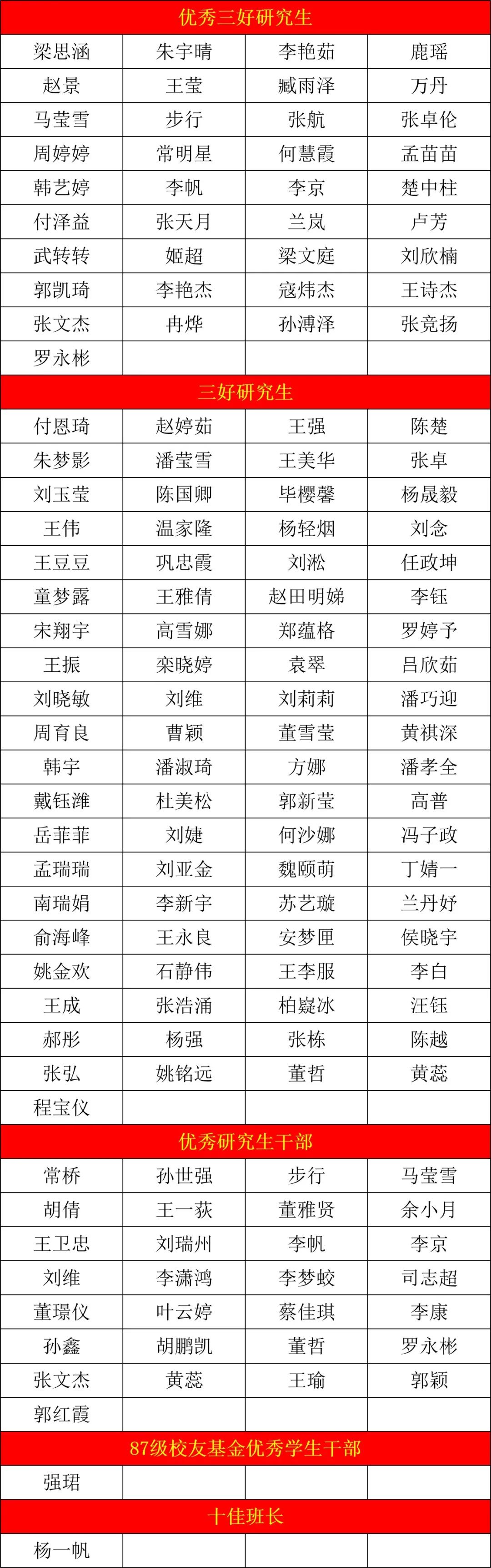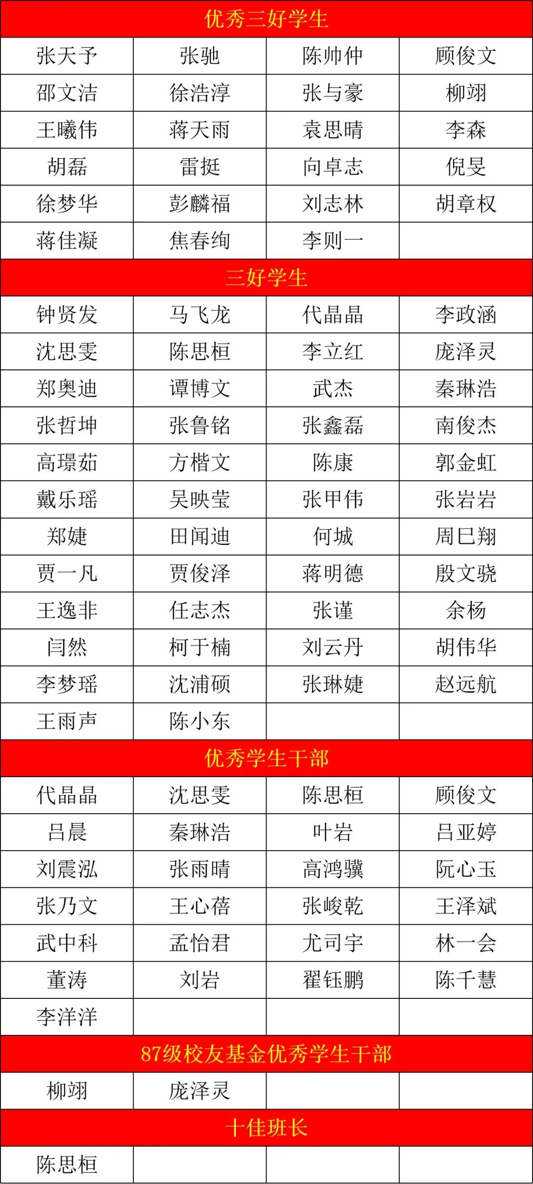经学生申请,学院、培养单位推荐,学校学生评比表彰工作领导小组审定并公示,2020-2021学年本科生优秀三好学生、三好学生、优秀学生干部、优秀三好研究生、三好研究生、优秀研究生干部、87级校友基金优秀学生干部、十佳班长的评选工作已经完成,获得荣誉称号的学生共4313名。其中,本科生优秀三好学生524名,三好学生1051名,优秀学生干部666名,优秀三好研究生548名(含研究生国家奖学金获得者171名、十佳学术之星及提名奖获得者7名),三好研究生1110名,优秀研究生干部384名,87级校友基金优秀学生干部20名,十佳班长10名。