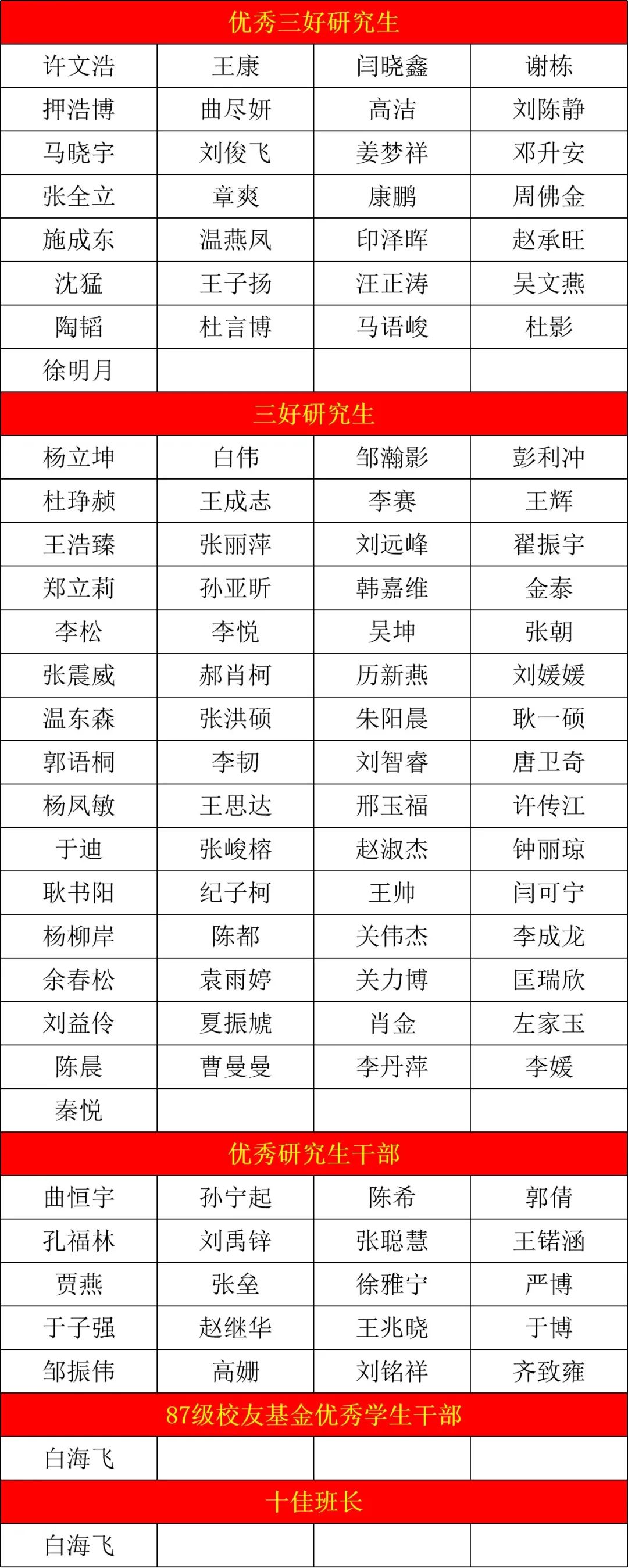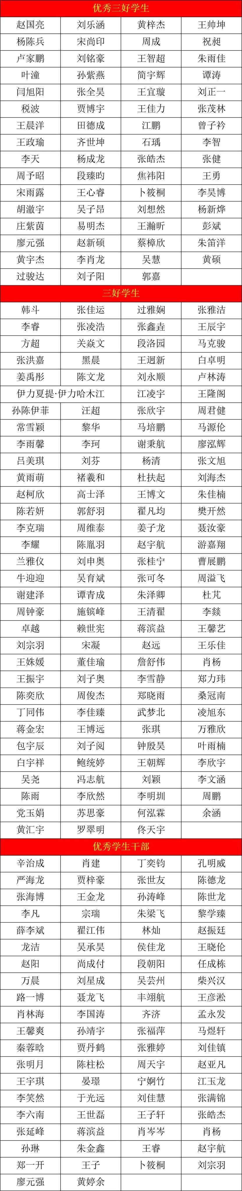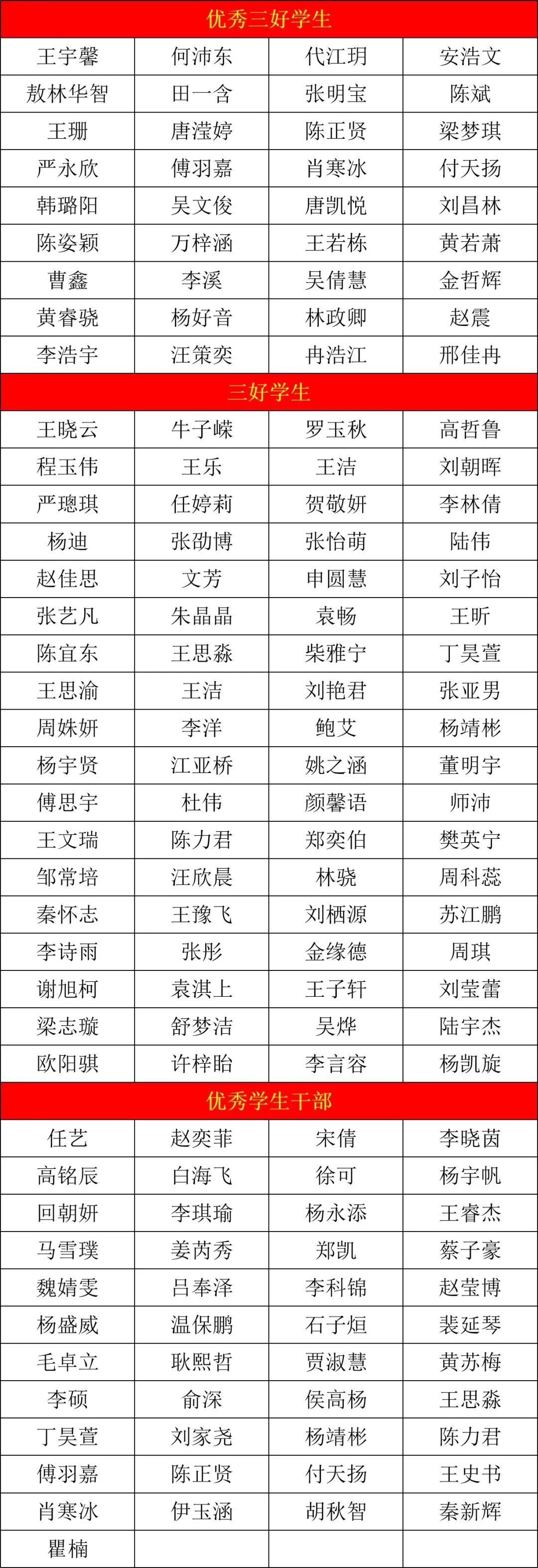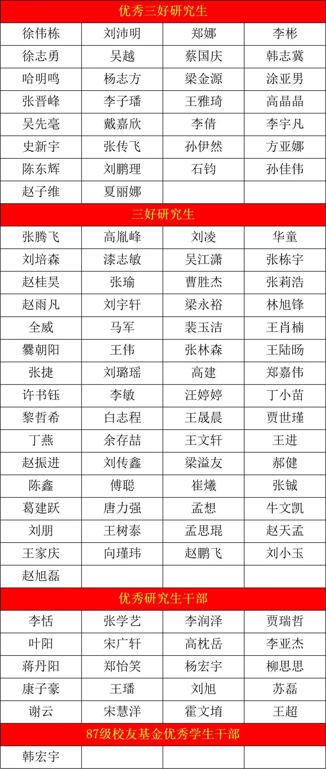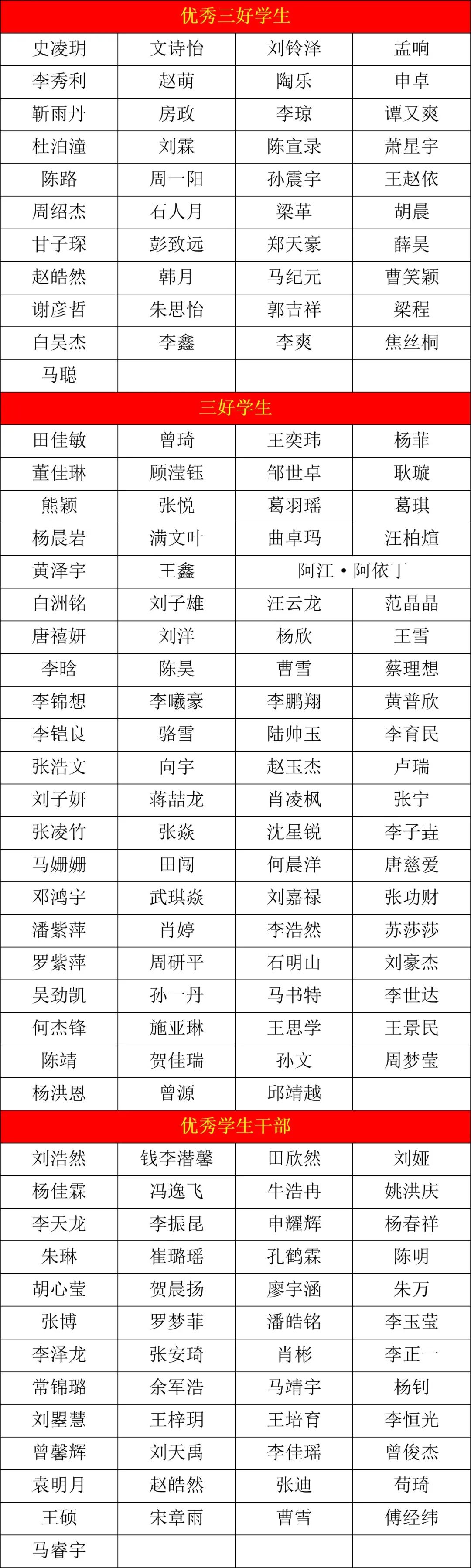 经学生申请,学院、培养单位推荐,学校学生评比表彰工作领导小组审定并公示,2020-2021学年本科生优秀三好学生、三好学生、优秀学生干部、优秀三好研究生、三好研究生、优秀研究生干部、87级校友基金优秀学生干部、十佳班长的评选工作已经完成,获得荣誉称号的学生共4313名。其中,本科生优秀三好学生524名,三好学生1051名,优秀学生干部666名,优秀三好研究生548名(含研究生国家奖学金获得者171名、十佳学术之星及提名奖获得者7名),三好研究生1110名,优秀研究生干部384名,87级校友基金优秀学生干部20名,十佳班长10名。