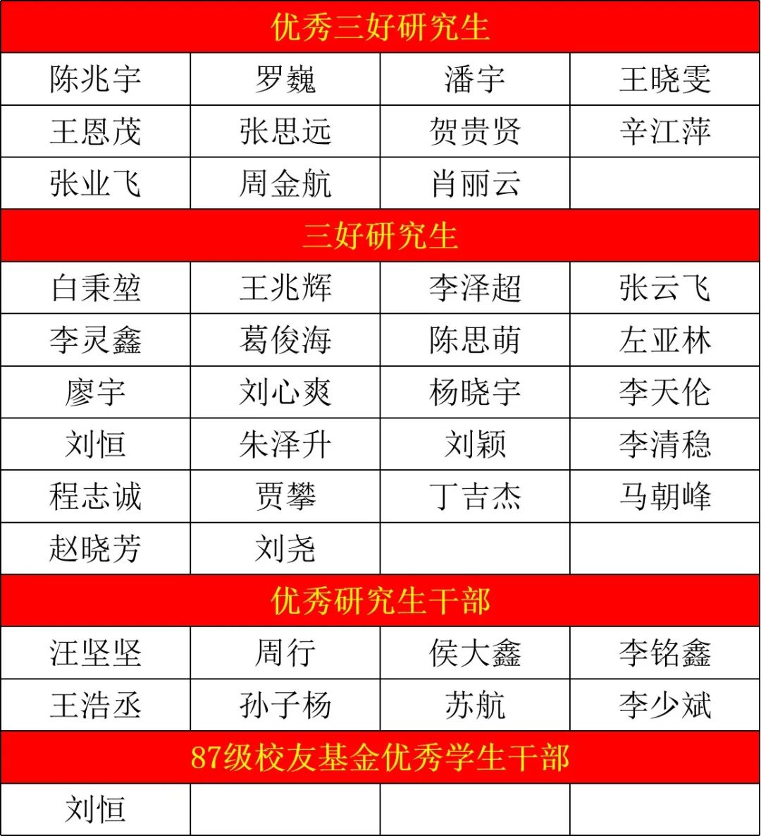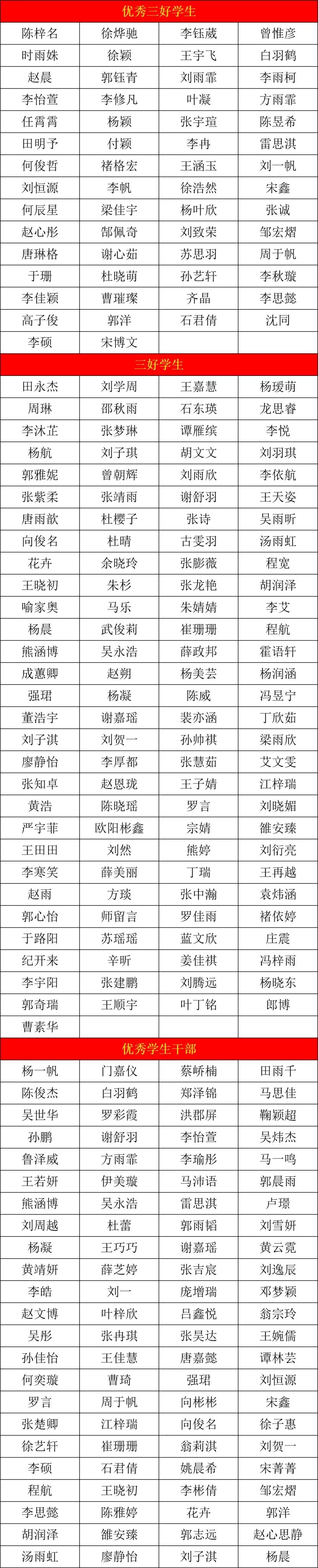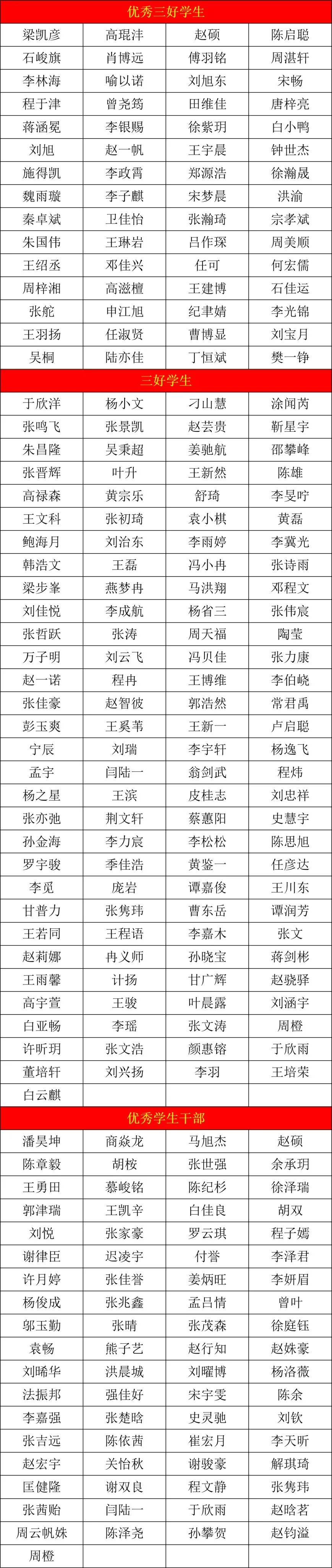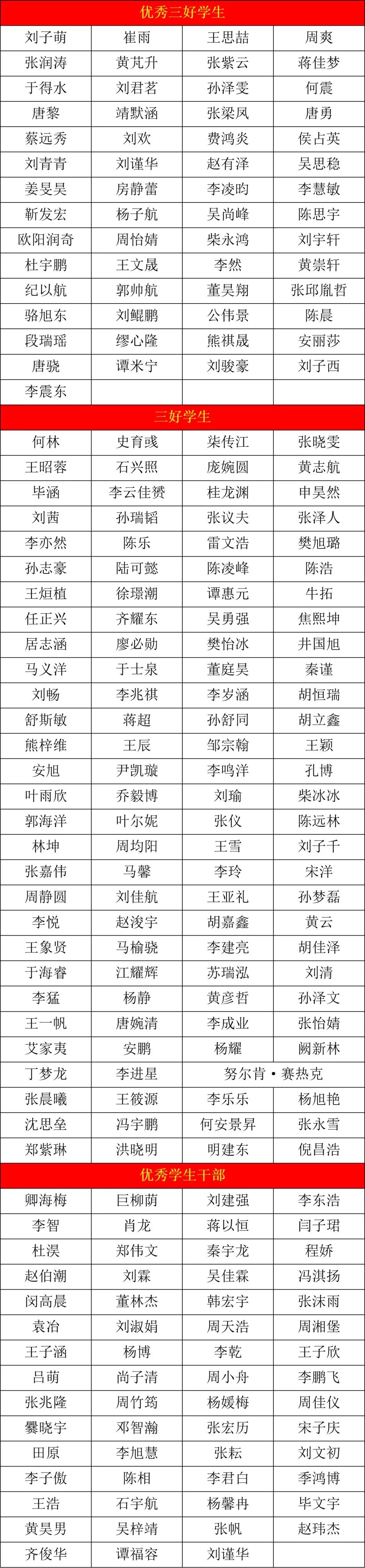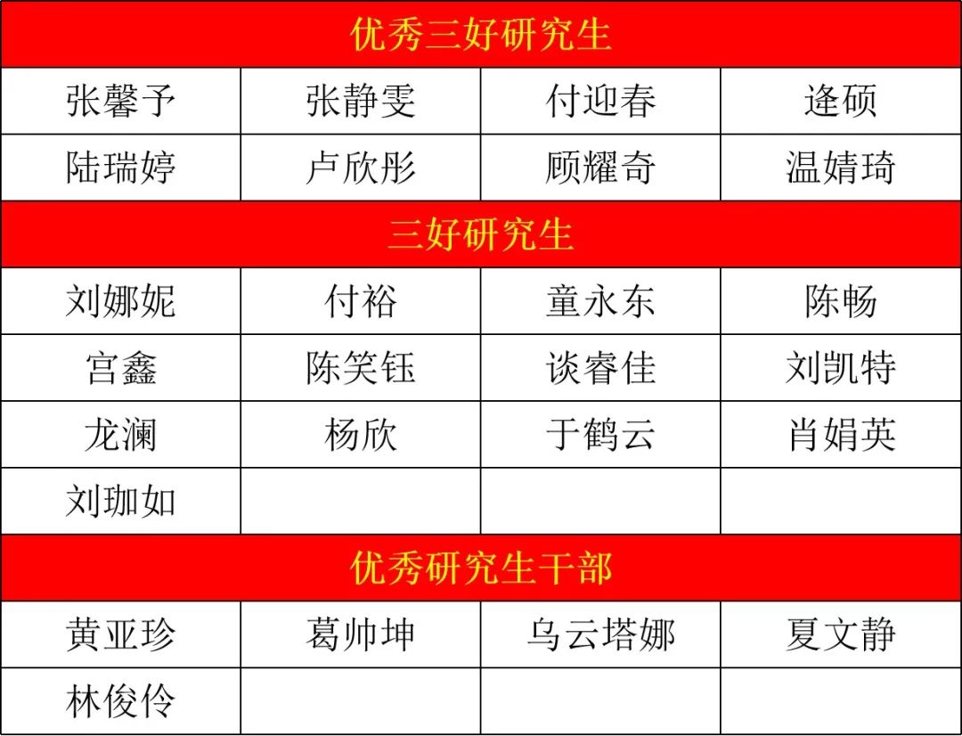 经学生申请,学院、培养单位推荐,学校学生评比表彰工作领导小组审定并公示,2020-2021学年本科生优秀三好学生、三好学生、优秀学生干部、优秀三好研究生、三好研究生、优秀研究生干部、87级校友基金优秀学生干部、十佳班长的评选工作已经完成,获得荣誉称号的学生共4313名。其中,本科生优秀三好学生524名,三好学生1051名,优秀学生干部666名,优秀三好研究生548名(含研究生国家奖学金获得者171名、十佳学术之星及提名奖获得者7名),三好研究生1110名,优秀研究生干部384名,87级校友基金优秀学生干部20名,十佳班长10名。