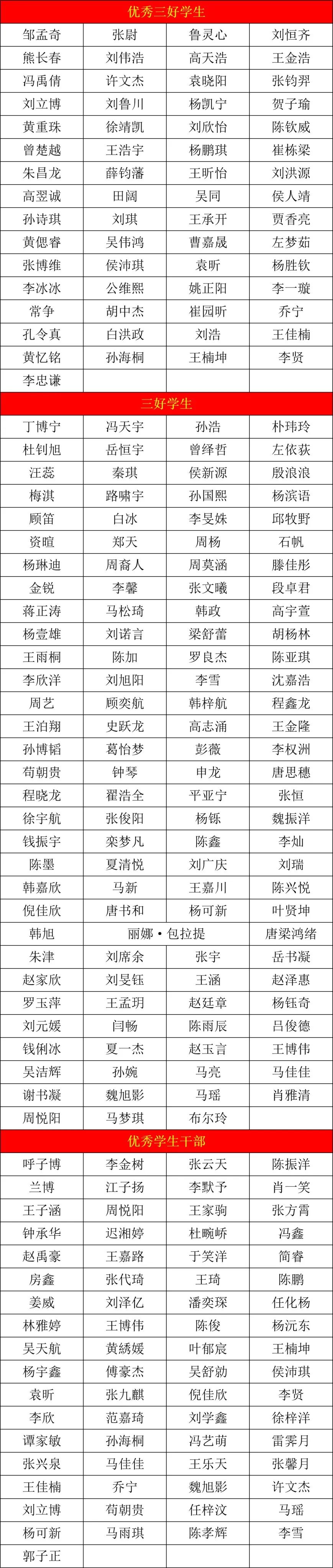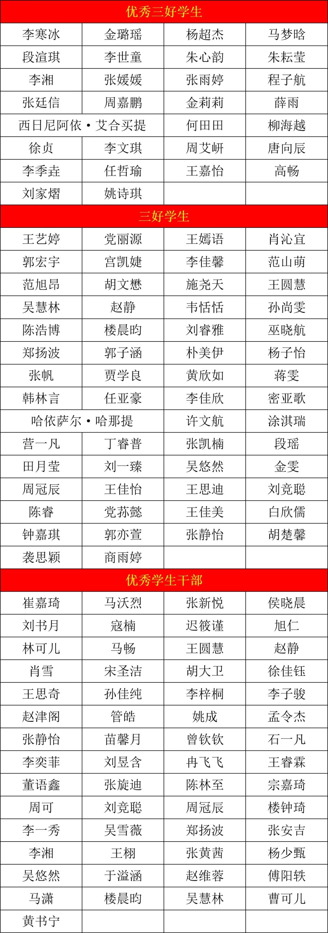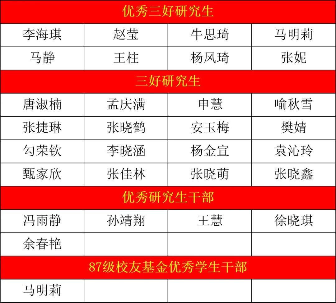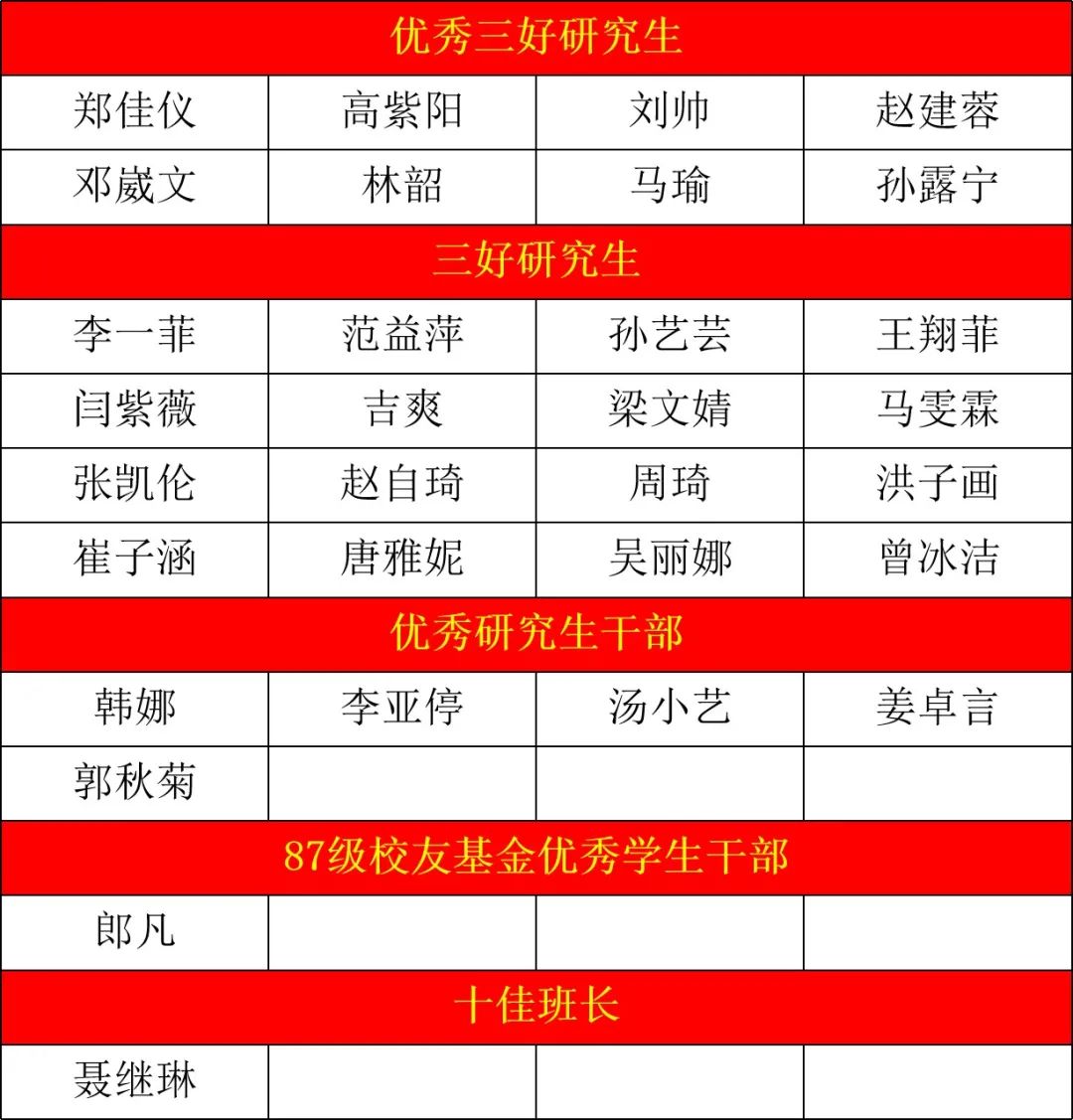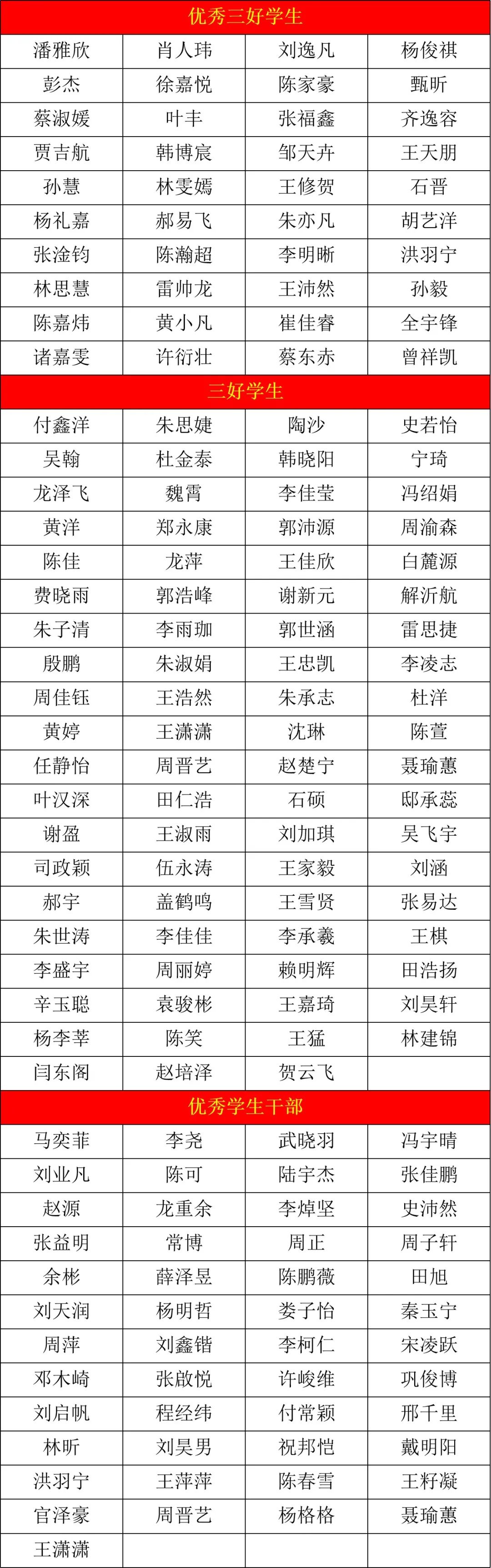 经学生申请,学院、培养单位推荐,学校学生评比表彰工作领导小组审定并公示,2020-2021学年本科生优秀三好学生、三好学生、优秀学生干部、优秀三好研究生、三好研究生、优秀研究生干部、87级校友基金优秀学生干部、十佳班长的评选工作已经完成,获得荣誉称号的学生共4313名。其中,本科生优秀三好学生524名,三好学生1051名,优秀学生干部666名,优秀三好研究生548名(含研究生国家奖学金获得者171名、十佳学术之星及提名奖获得者7名),三好研究生1110名,优秀研究生干部384名,87级校友基金优秀学生干部20名,十佳班长10名。