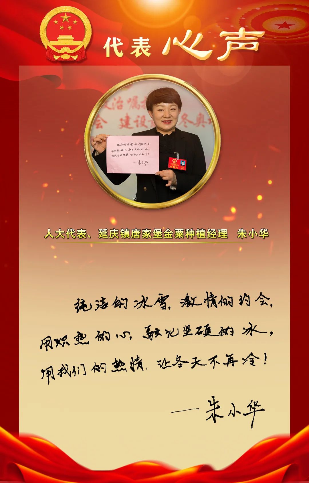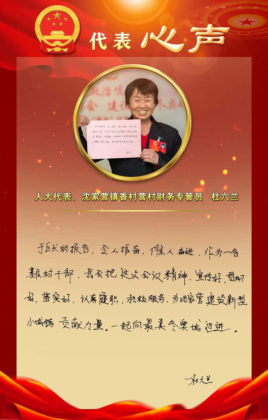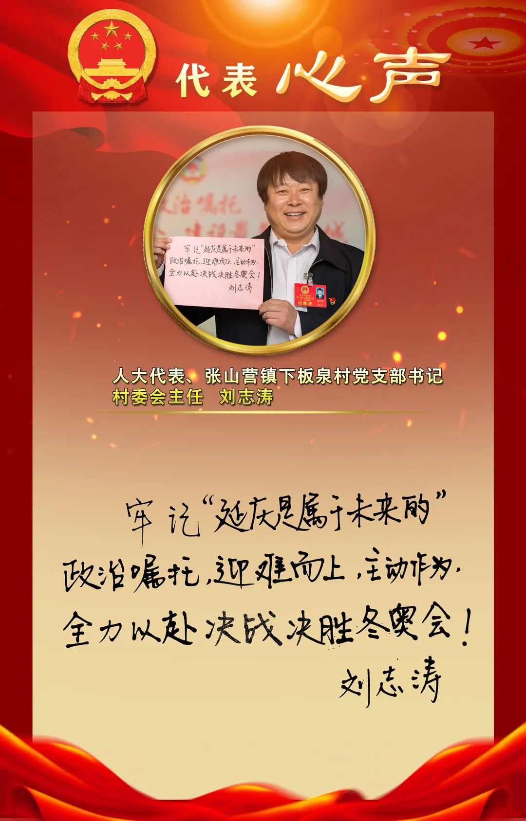 12月15日,北京市延庆区第三届人民代表大会第一次会议隆重开幕,与会人大代表们在大会中认真听取了《政府工作报告》,大家纷纷结合自己的工作实际,就如何做好今后的工作,表达心声并手写寄语。