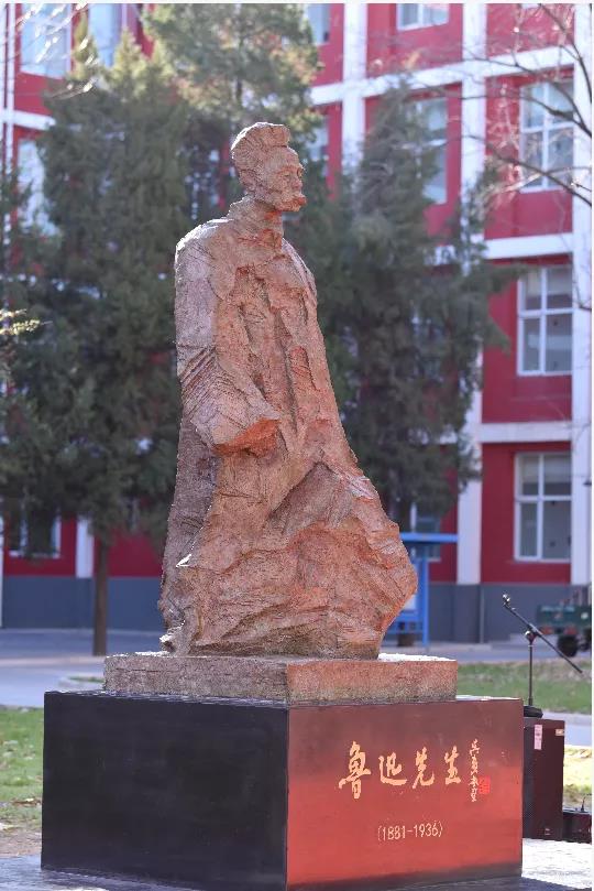 这尊鲁迅铜像是根据1927年至1930年间,鲁迅先生在上海光华大学讲演时的剪影而塑,作品以写意的手法塑造,净高2.7米,轮廓清晰、线条刚毅,微微昂起的头透露出鲁迅先生坚定的信念,屹立于北语整饬一新的教二楼门前,彰显着北语的精神底蕴和人文气质。