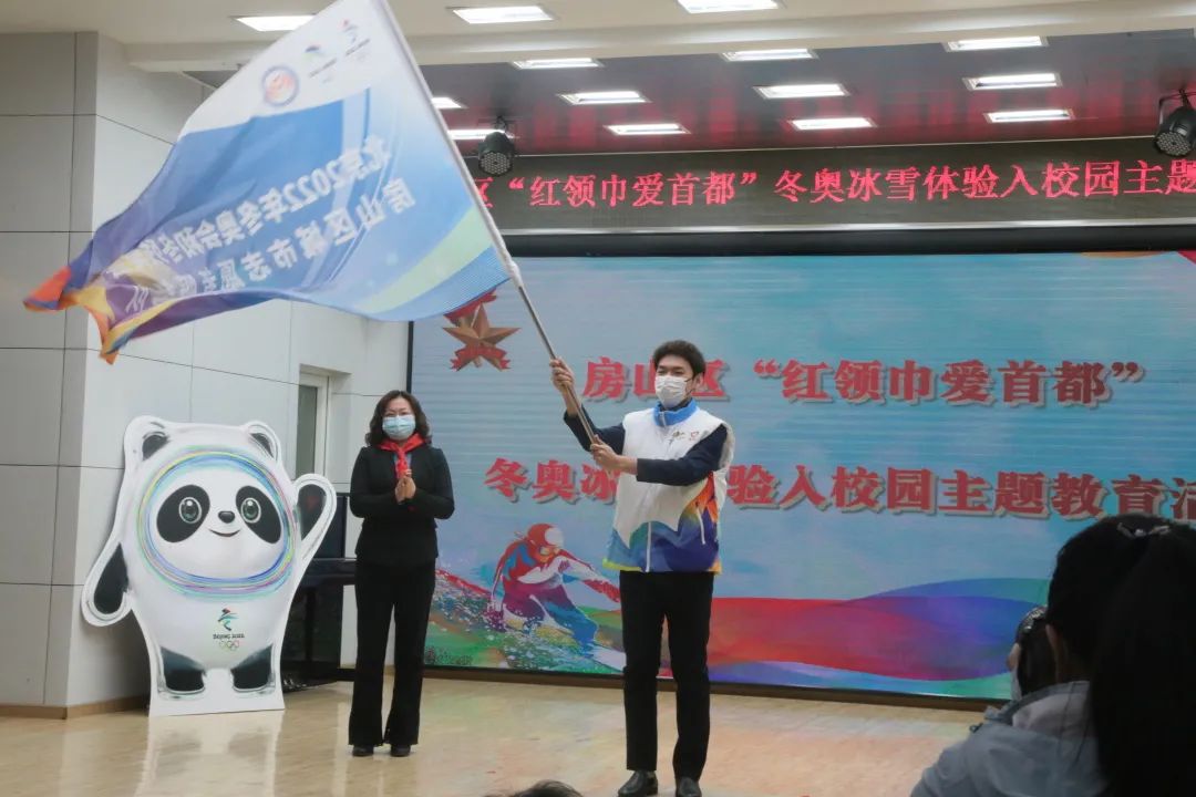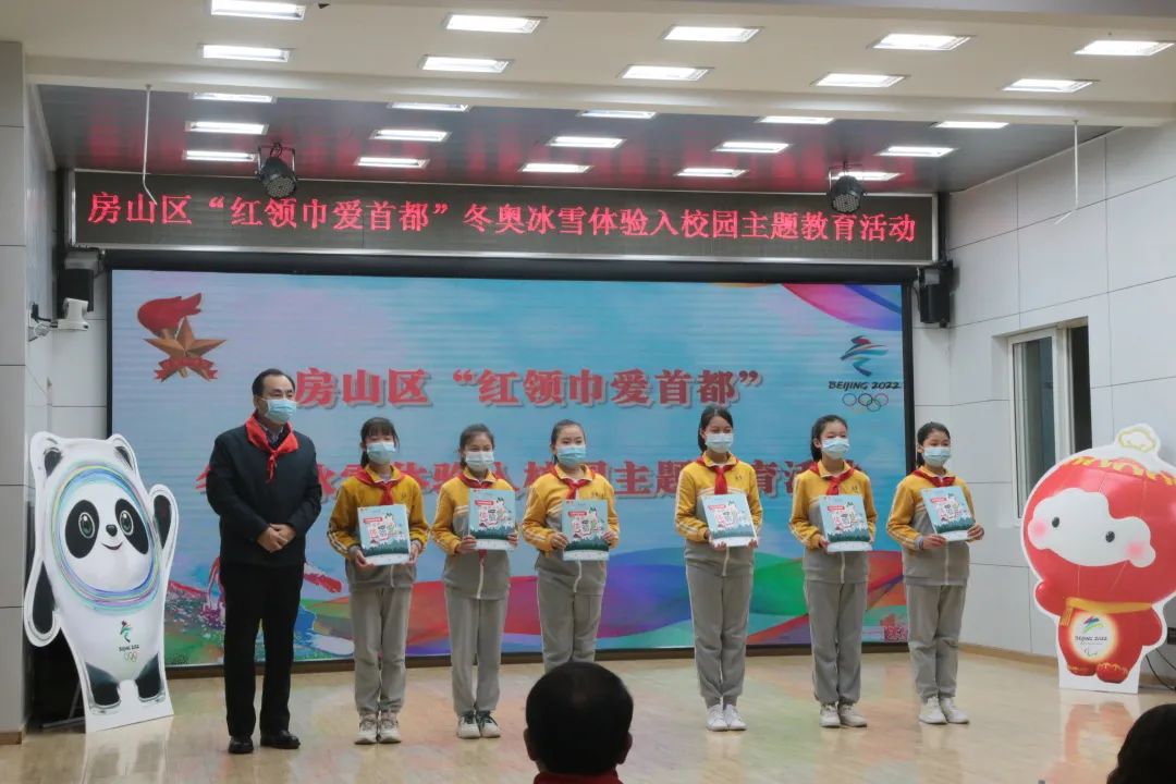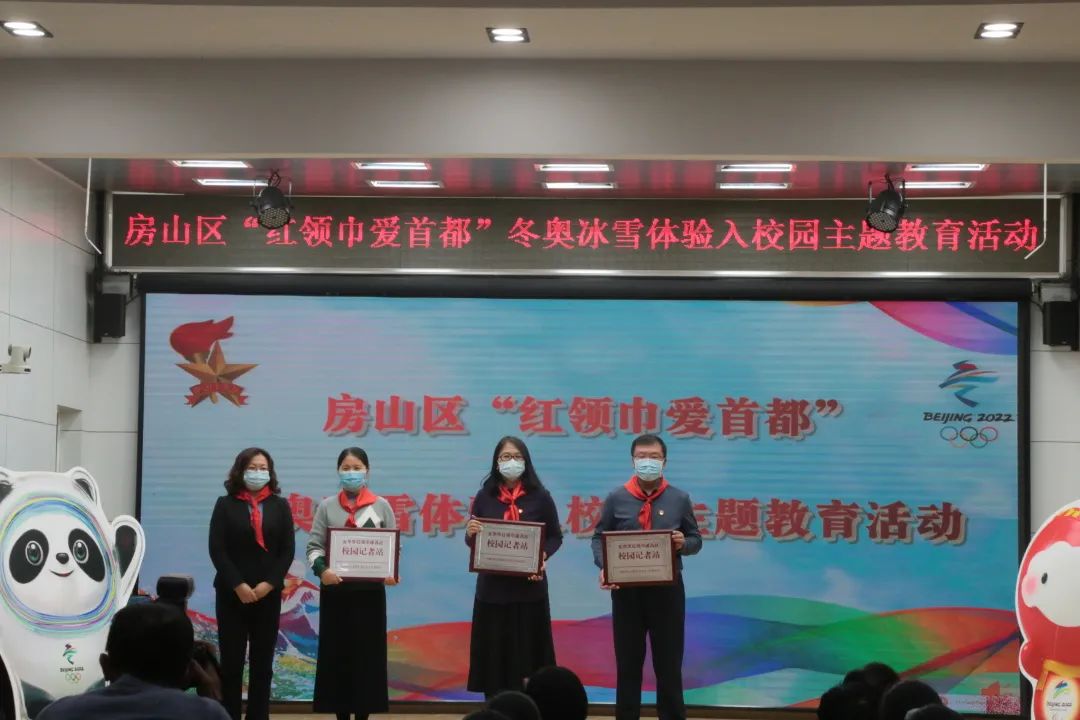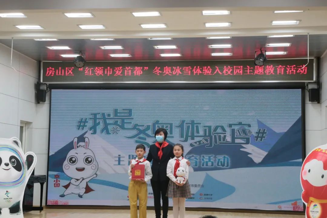 区委教育工委书记、区少工委相关负责人为少先队员们颁发了冬奥体验活动任务闯关卡;区委宣传部分管日常工作的副部长、区文明办相关负责人为首都师范大学附属房山学校、北京小学长阳分校、北工商附属小学三所新建的红通社校园记者站颁牌并为城市志愿者代表授旗;团市委副书记为少先队员代表赠送“京小团”和冬奥主题记事本。
