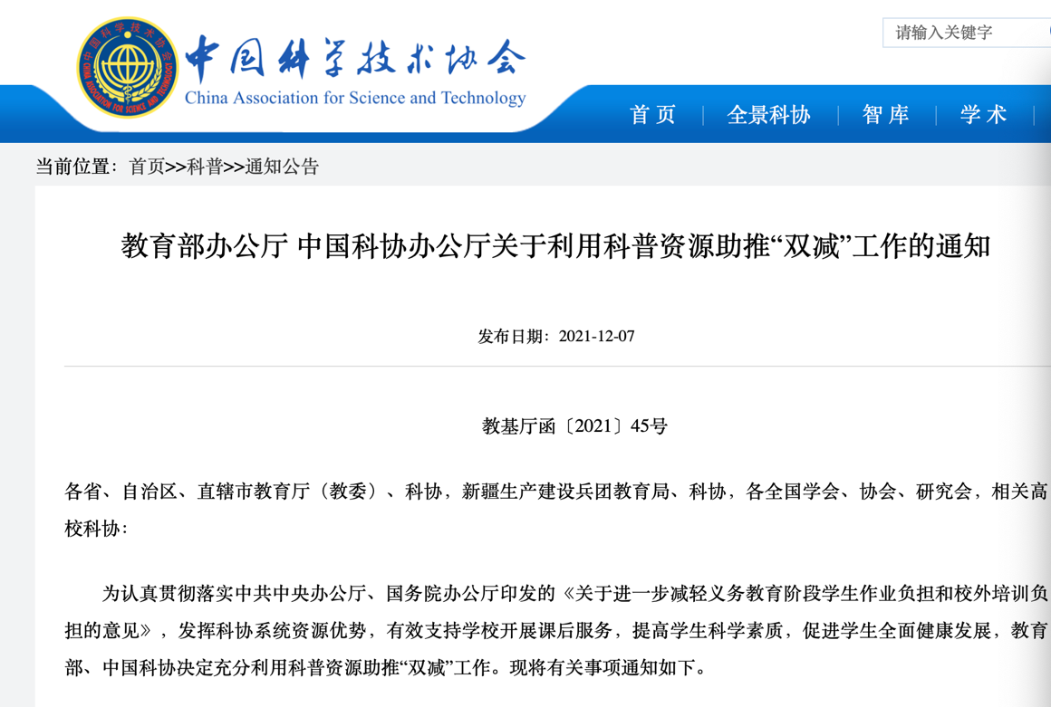 12月7日,教育部、中国科协联合发布《关于利用科普资源助推“双减”工作的通知》(以下简称《通知》),提出要利用科普资源助推“双减”工作,要求各地各校要以“请进来”的方式,引进一批优秀科普人才和科普机构,有效开展科普类课后服务活动项目;还要求各地各学校“走出去”,有计划地组织学生就近分期分批到科技馆和各类科普场馆教育基地,加强场景式、体验式、互动式、探究式科普教育实践活动。