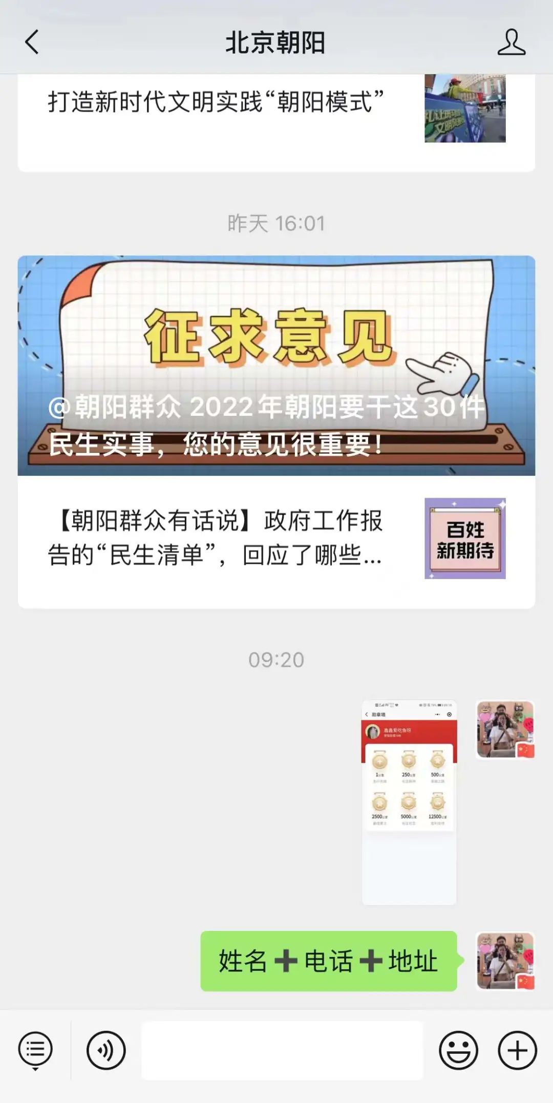 ②请在2021年12月27日12:00点前,将勋章截图+姓名+电话+地址发送至北京朝阳微信后台,届时工作人员会为您寄出奖品。例如↓