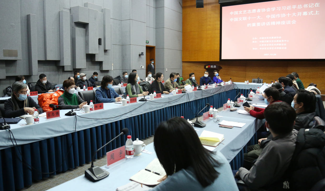 12月28日下午,“中国文艺志愿者协会学习习近平总书记在中国文联十一大、中国作协十大开幕式上的重要讲话精神座谈会”在丰台区北京汽车博物馆召开。会议由中国文艺志愿者协会副秘书长、中国文联文艺志愿服务中心副主任吴艳华主持,中国文艺志愿者协会、北京市文联和参与中国文联新时代文明实践试点项目的丰台区文联、东城文联、朝阳文联,三级组织艺术家代表40余名参加了此次座谈会。