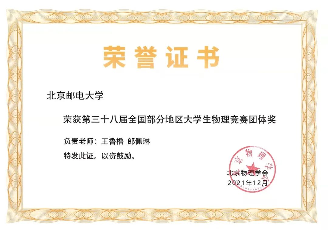 12月5日,由北京物理学会主办的第38届全国部分地区大学生物理竞赛正式举行,我校师生喜获竞赛团体奖,51名北邮学子分获各类奖项,其中一等奖9人、二等奖23人,三等奖19人。