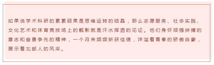 2021年12月,共青团中央和共青团北京市委分别对暑期社会实践活动予以表彰。在全国大中专学生志愿者暑期文化科技卫生“三下乡”社会实践活动中,我校晨馨未来公益支教团队荣获优秀团队。在 “青年服务国家”首都大学生社会实践活动中,我校获评先进单位;晨馨未来公益支教团队、“科技赋能,红色筑梦”助顺有我团队、“聚焦‘两山’实践,探索振兴典型”——北邮赴浙江安吉暑期实践调研团、“百年湘江”社会实践团队、“追风赶月前行者”新时代文明实践团、“追溯红色星火,筑梦百年征程”实践团队获评优秀团队;杨梓豪、吴静、王全举、王飞阳、王丹、孙雨君获评先进工作者;徐茗、康苗、马玉龙、杨忱逊、王焱仟、王伟获评先进个人。