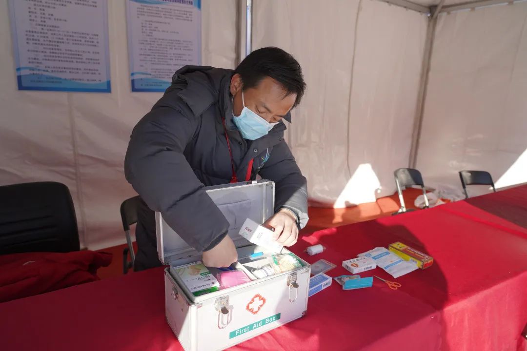 记者在现场看到,雪场还设置了咨询处,并配备了碘伏、绷带、治疗跌打损伤药品、口罩等物资,方便有需要的游客使用。