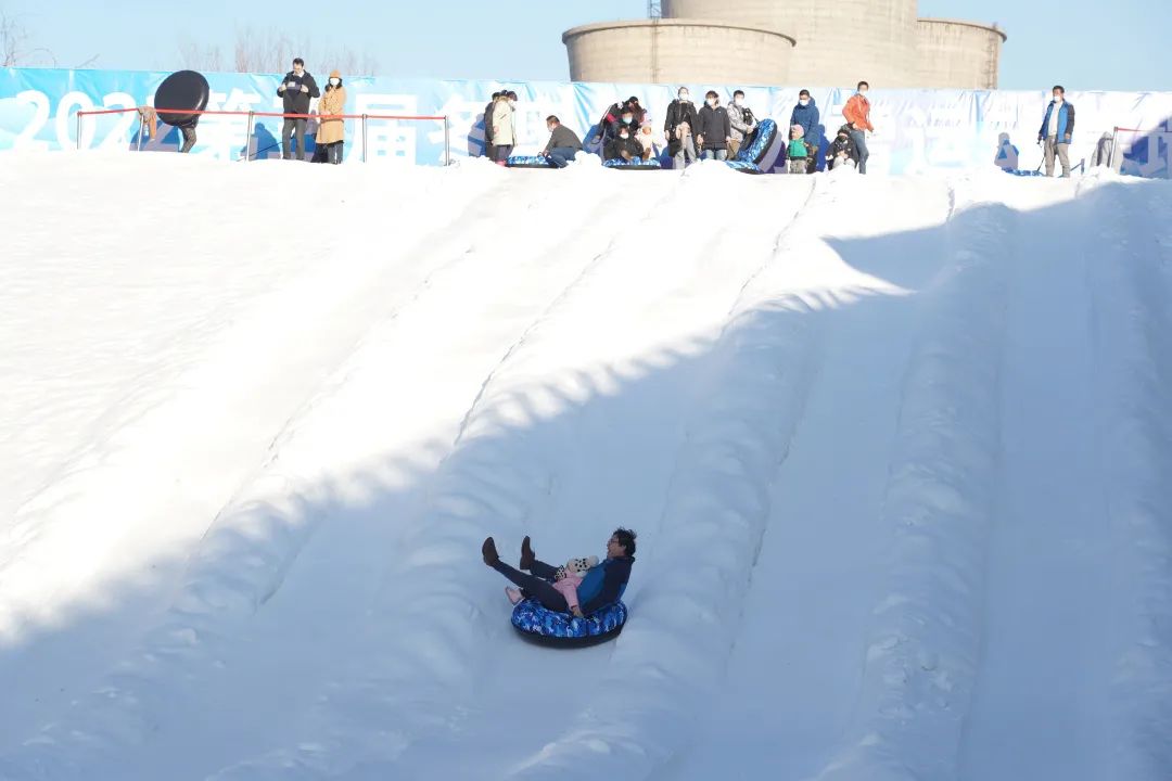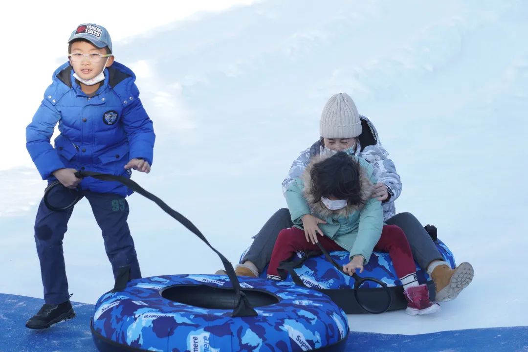 有雪滑梯区、游玩区和冰雕造型区三部分。雪滑梯共有6条雪道,大家可以坐着雪上飞碟,从高6米的雪道俯冲滑下。游玩区有雪地转转、雪地自行车、卡通造型的雪地小推车等。在冰雕区能看到冰墩墩、雪融容的冰雕,以及造型灯饰,晚上还将上演冰上灯光秀。