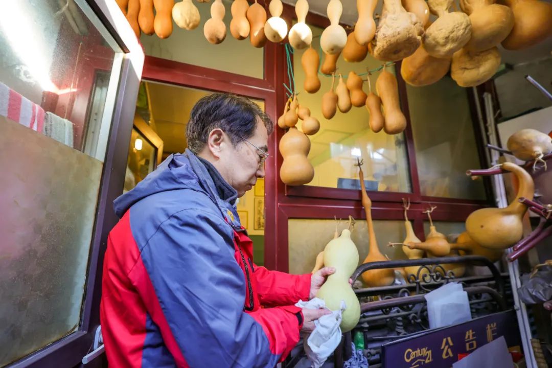 除了篆刻,龚虎彪还尝试制作奥运主题烙画葫芦。在东四五条胡同的这间小平房里挂满了大大小小种类繁多的葫芦:三庭葫芦,八宝葫芦,粗腰葫芦,油锤葫芦……都是他从花鸟市场上精心淘来的宝贝。