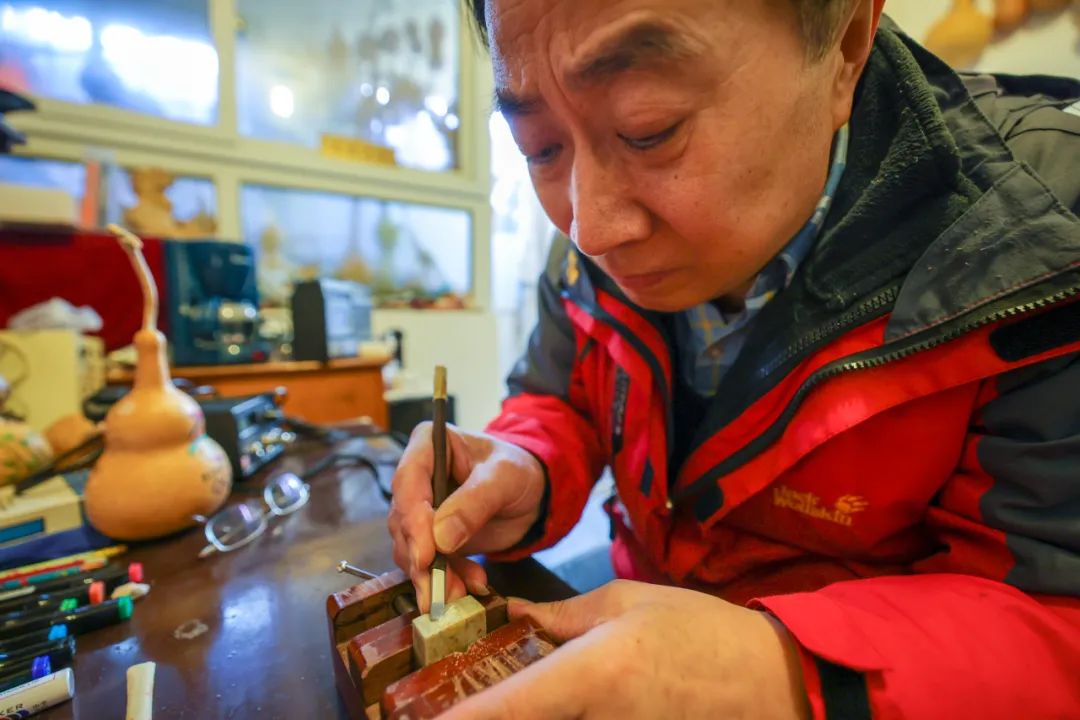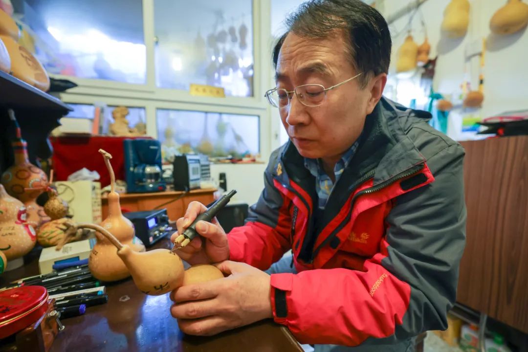 “2008年,北京举办了夏季奥运会。2022年,北京又要迎来冬季奥运会。我们北京如今是‘双奥之城’了,我们社区要争做‘双奥社区’。”龚虎彪用铅笔在葫芦上打好底稿,烙笔落下,烟雾缭绕,生动的“冰墩墩”、“雪容融”、冬奥会会徽……就在葫芦上呼之欲出了。