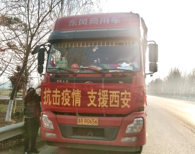1月2日下午3点,挂着“抗击疫情,支援西安”红横幅的鲁RR0656货车从山东菏泽曹县出发,前往陕西西安。44岁的车主张建成和妻子董玉娥对于这条线路并不陌生,在以往几年,夫妻二人也时常走这趟线路送货。