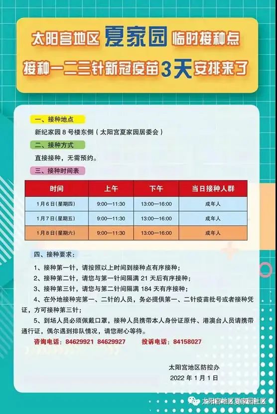 夏家园社区还未接种一二三针的成年居民群众,均可以于1月6日、7日、8日到临时接种点接种。接种人群将获赠小礼包,其中60岁以上老人接种成功还可以领取营养免疫增强包!