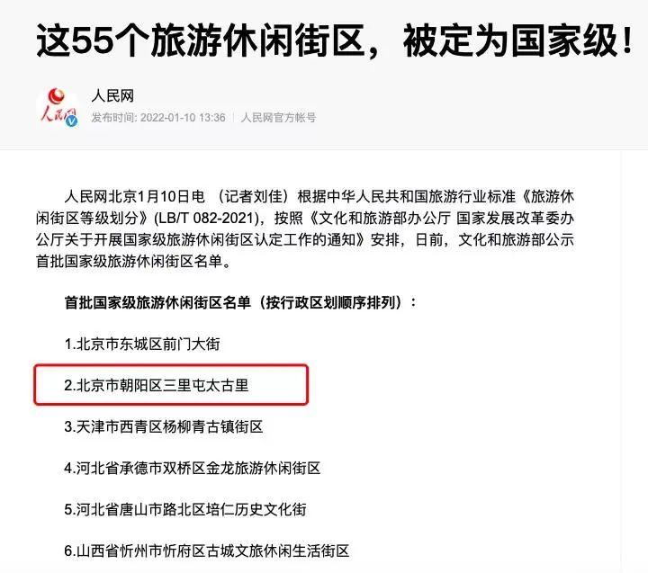 日前,文化和旅游部公示首批国家级旅游休闲街区名单,经评审,全国55条街区入选首批国家级旅游休闲街区。三里屯太古里成为北京市两个入选街区之一。