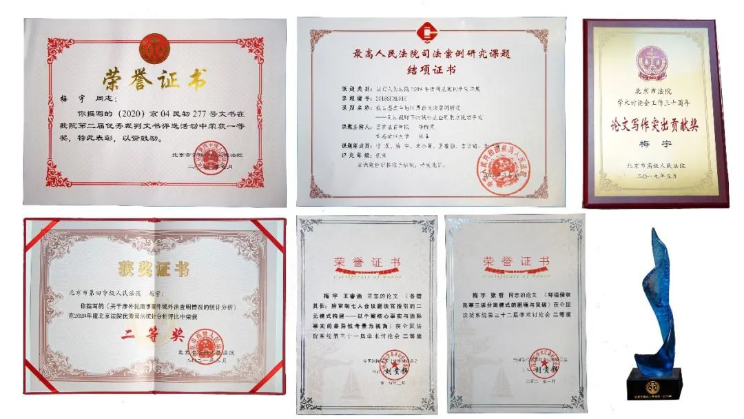 繁忙办案之余,梅宇十八年如一日潜心司法实务研究,勤思善辨、笔耕不辍。参与、执笔中国法学会、最高人民法院、北京市法学会的《关于合同继续履行的调研》《关于全面规范执行监督的调研》《社会主义核心价值观融入司法裁判研究》等8个重点调研课题,为民商事审判、司法体制改革、审判监督管理等前沿问题,提供了专业性、针对性、有效性建议。深度参与人民陪审员制度改革,撰写论文获最高人民法院 “人民陪审员制度改革理论和实践研究”征文一等奖,参与执笔中国法学会重点课题《人民陪审员主要进行事实认定实证研究》,评定为优秀课题并由中国法制出版社出版。积极参与《人民陪审员法》立法论证和相关司法解释、司法政策文件的编撰研讨,为人民陪审员制度改革实践贡献智慧。