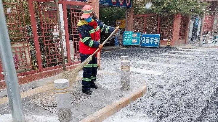 为应对极端天气,街道市民诉求处置中心启动应急响应,组织保洁员开展扫雪铲冰作业,截止16时,共出动保洁人员60人次,辖区道路逐渐恢复“原貌”,为居民创造安全通行环境。