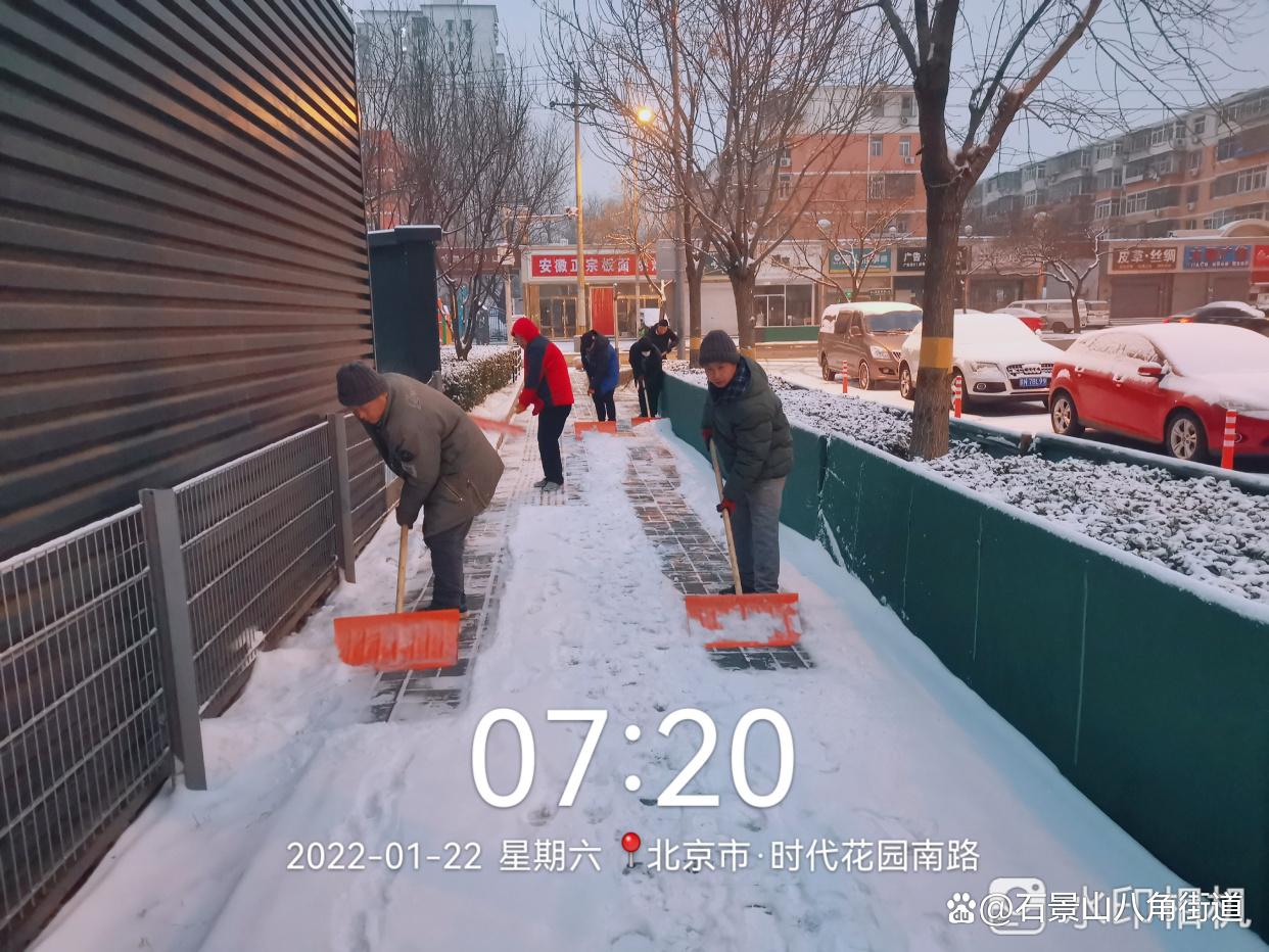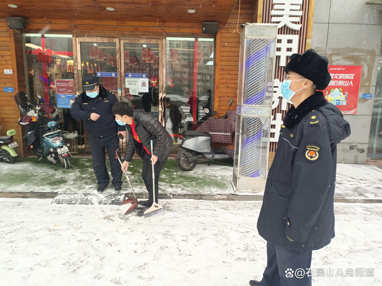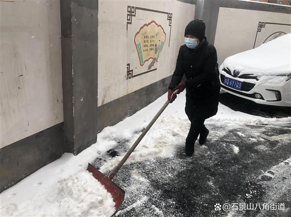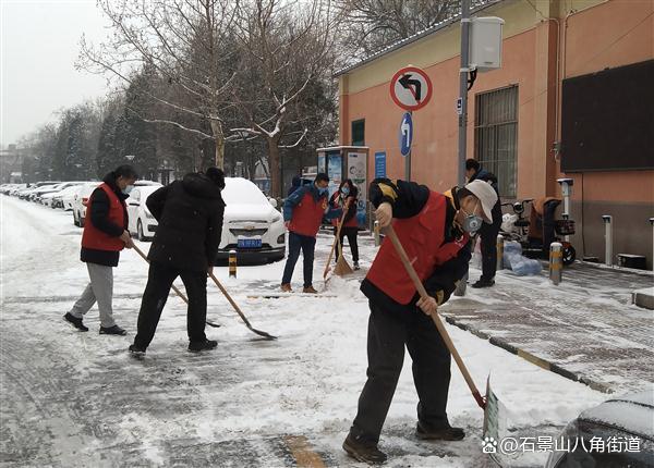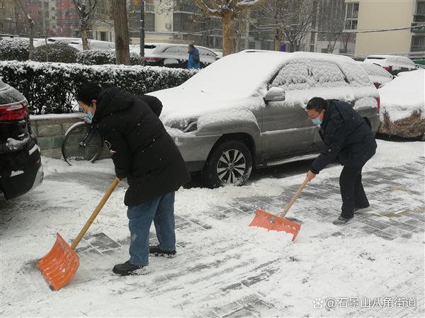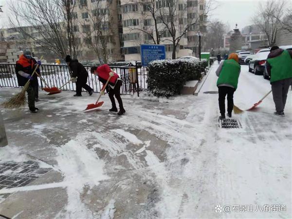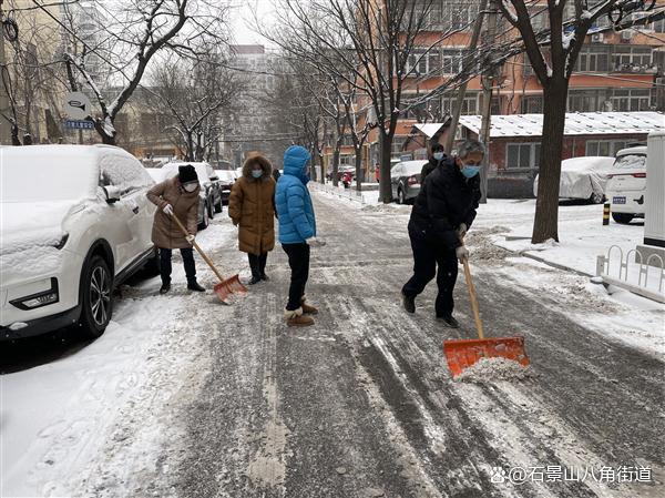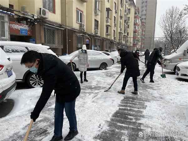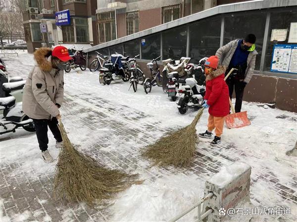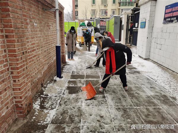景阳东街第二社区、八角路社区、八角南里社区、八角南路社区、八角中里社区、地铁家园社区、景阳东街第一社区、公园北社区、黄南苑社区、体育场南路社区、杨庄中区社区、时代花园社区、杨庄北区社区、杨庄南区社区、杨庄北区第二社区、古城南里社区开展扫雪铲冰行动,组织在职党员、老街坊与物业,对社区内主干路步道出入口及单元门、坡道积雪等重点区域进行清理,奏响积雪清扫协奏曲,为居民扫出一条条“安全路”。热火朝天的劳动场面让严寒的天气也显得暖意浓浓,同时提醒出行居民注意防寒保暖,避免或减少外出防止摔伤。