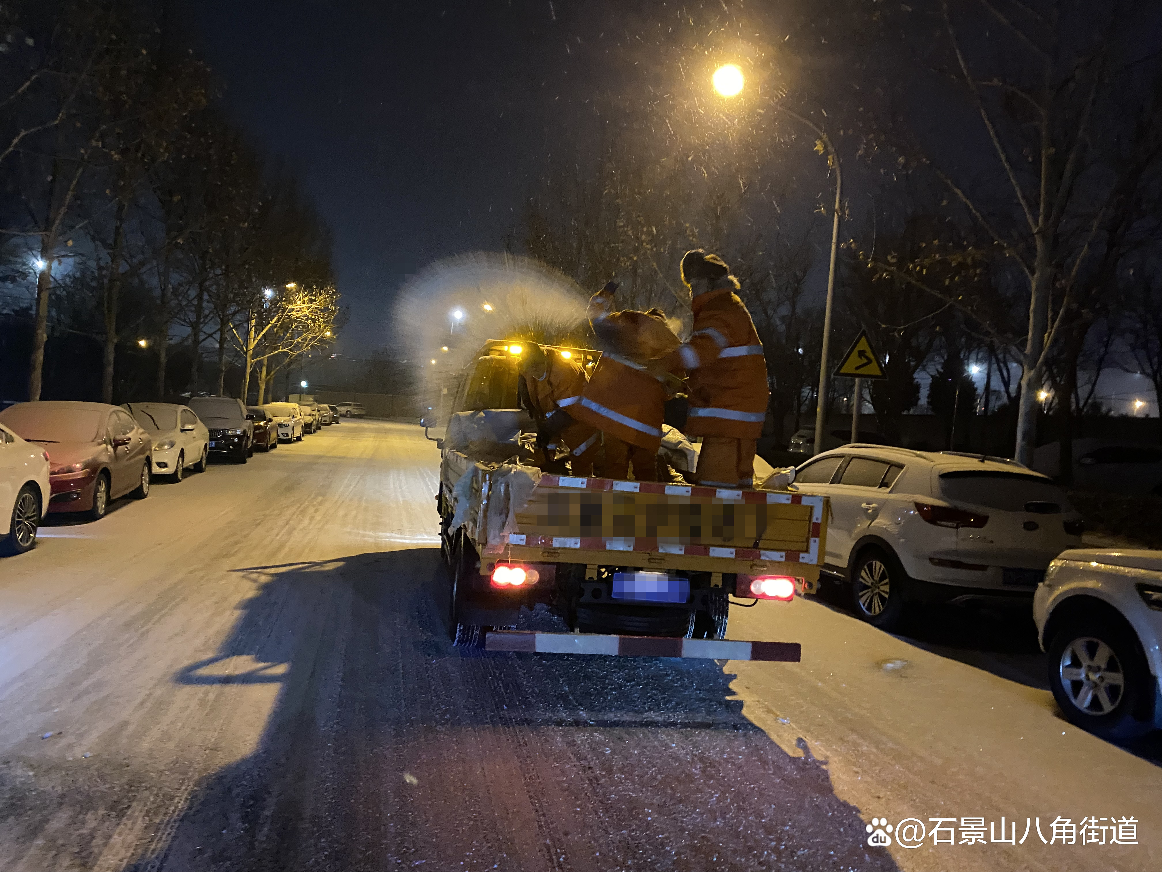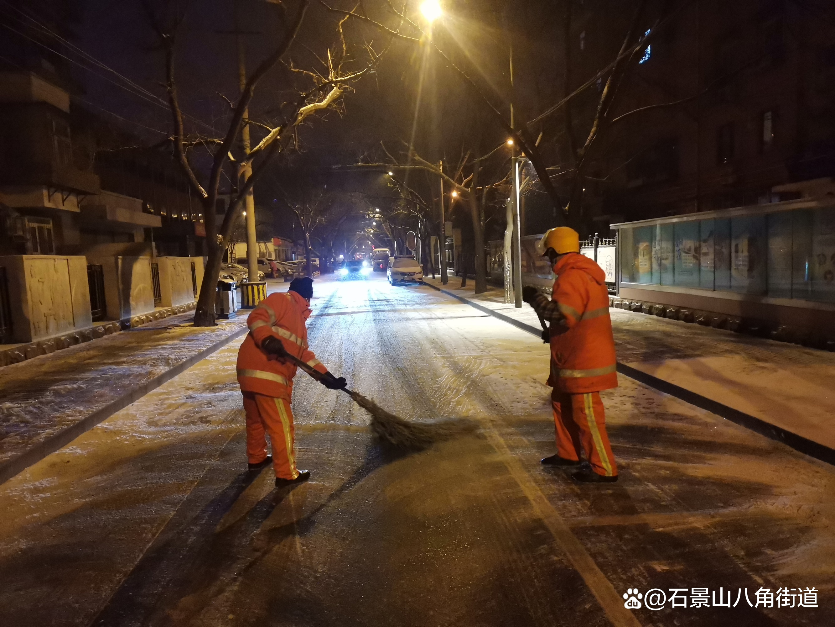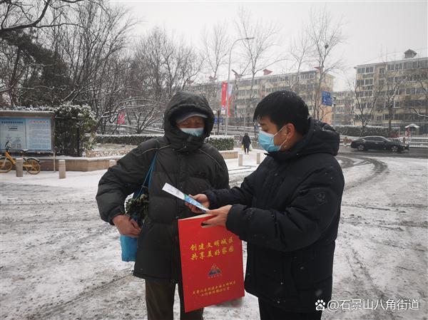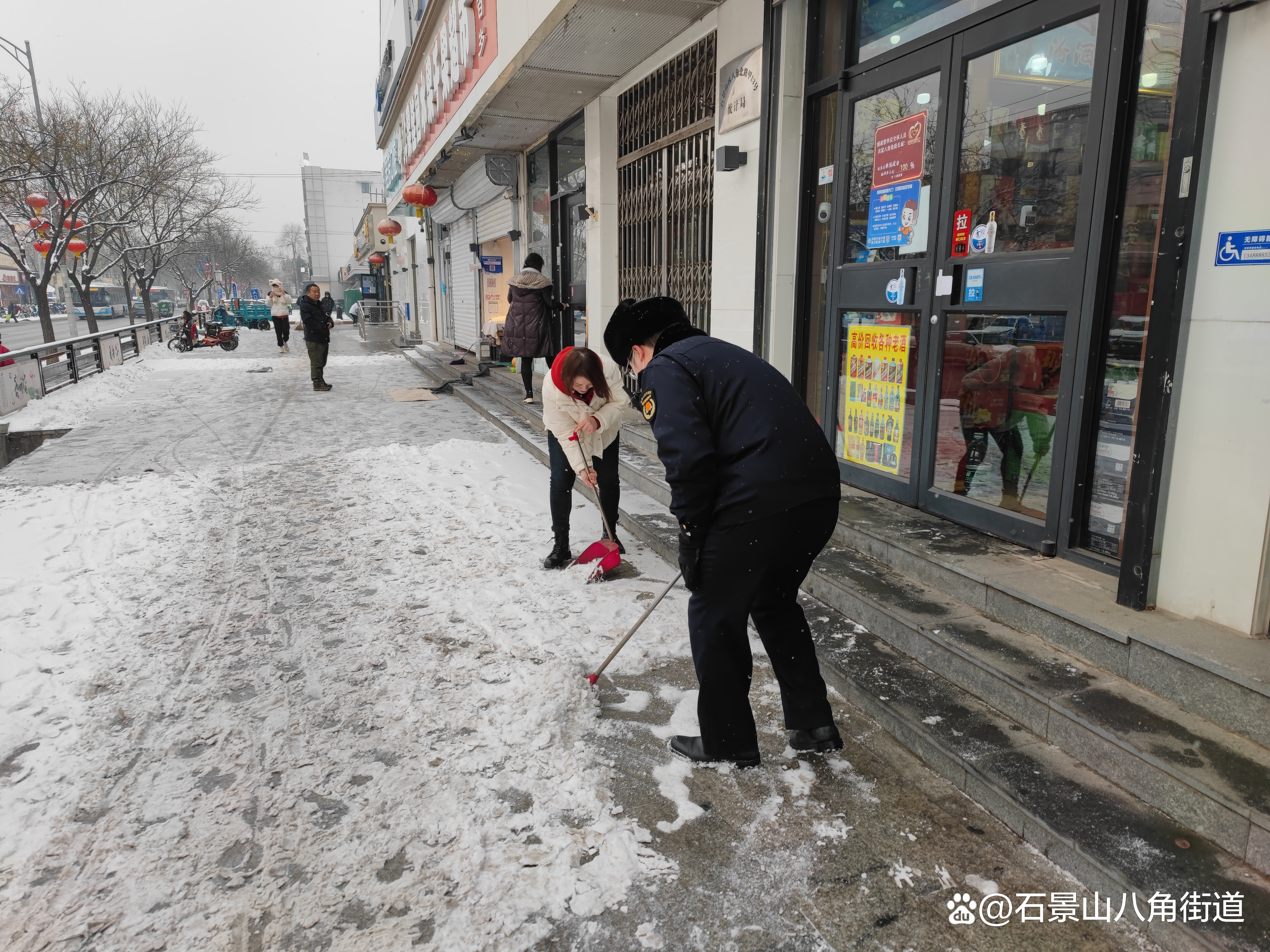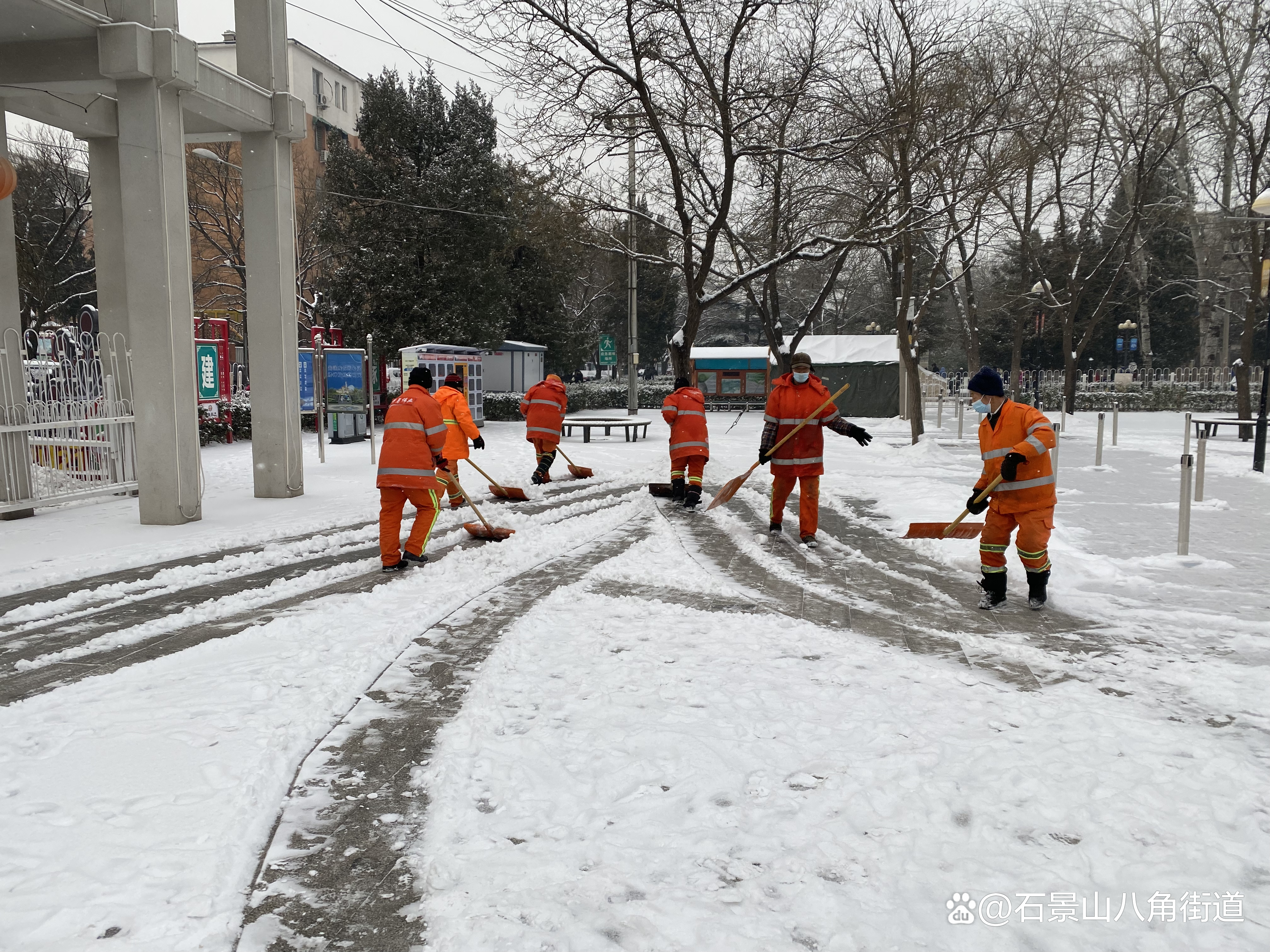 景阳东街第二社区、八角路社区、八角南里社区、八角南路社区、八角中里社区、地铁家园社区、景阳东街第一社区、公园北社区、黄南苑社区、体育场南路社区、杨庄中区社区、时代花园社区、杨庄北区社区、杨庄南区社区、杨庄北区第二社区、古城南里社区开展扫雪铲冰行动,组织在职党员、老街坊与物业,对社区内主干路步道出入口及单元门、坡道积雪等重点区域进行清理,奏响积雪清扫协奏曲,为居民扫出一条条“安全路”。热火朝天的劳动场面让严寒的天气也显得暖意浓浓,同时提醒出行居民注意防寒保暖,避免或减少外出防止摔伤。