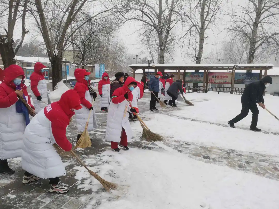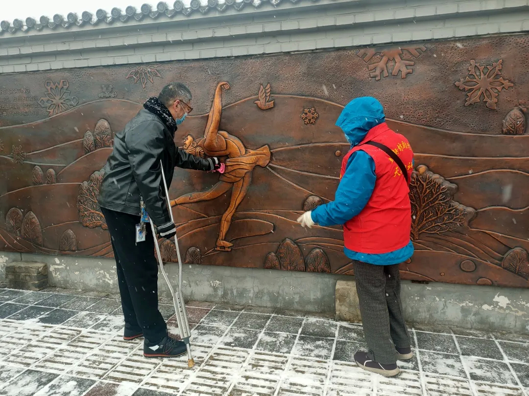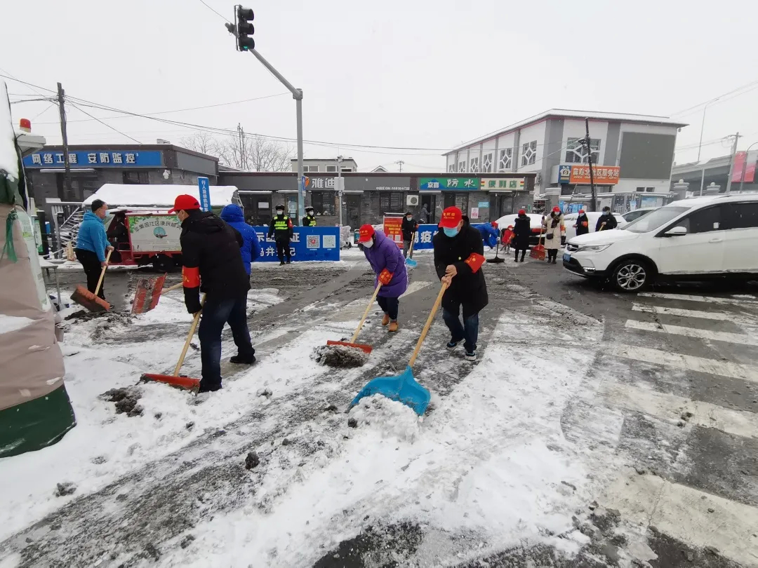 五里坨街道组织机关干部、社区工作者、老街坊志愿者、保洁人员等开展扫雪铲冰。纷纷扬扬的大雪并未组织大家的热情。凌晨开始,街道保洁人员冒雪开始扫雪作业,清理核酸检测点积雪,保障市民出行安全与核酸检测工作的顺利进行。冬奥先锋临时党支部的党员们、各社区工作人员、老街坊志愿者积极主动清扫居委会门前、社区小道及路边积雪,与此同时疫苗接种、核酸检测点工作不停歇,大家在疫苗接种现场承担人员引流、服务居民、体温检测、维护场地秩序等工作,以高度的责任感做到扫雪铲冰与疫苗接种服务工作两不误。