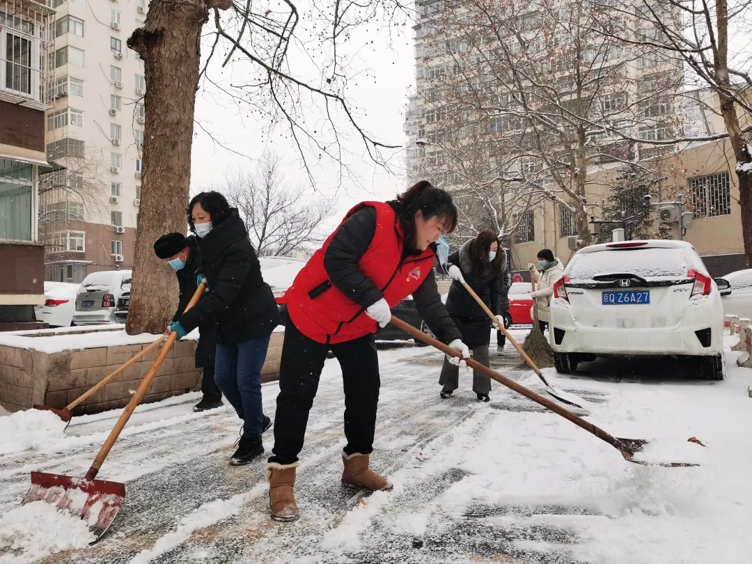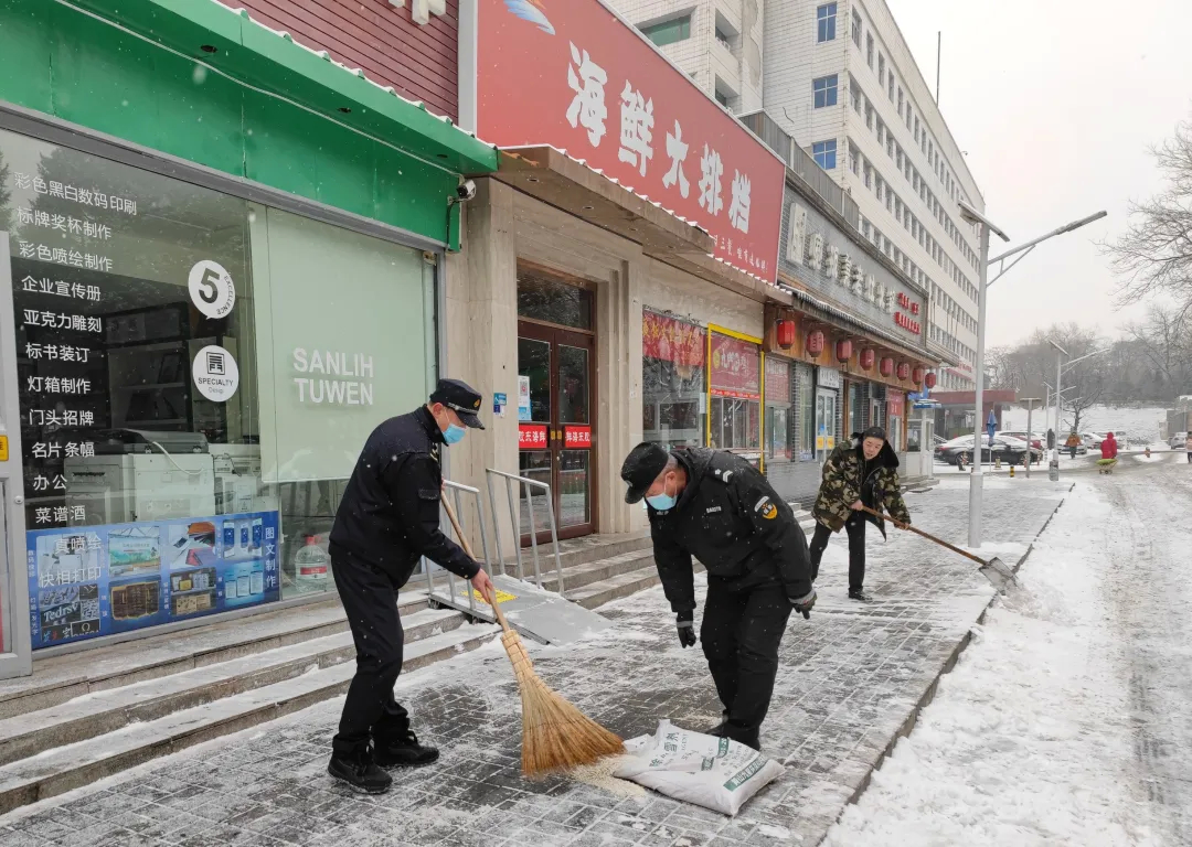 苹果园街道组织社区、商户、物业单位、应急队等开展扫雪铲冰作业。苹果园街道综合行政执法队加强应急值守,在做好疫情防控工作的同时,督促辖区临街商户和单位落实“门前三包”责任,做好扫雪铲冰工作;应急队伍对背街小巷进行全面扫雪,适度施撒环保融雪剂,为居民提供良好出行环境;社区工作人员积极发动社区“老街坊”、志愿者,联合物业单位一起上岗,利用铁锹、扫帚等工具有序清理社区周边道路及居民出行的主要路段上的积雪,同时各社区、商户坚持严格落实扫码、测温等防控措施,抓紧抓实疫情防控工作不放松,持续为居民的健康安全保驾护航。