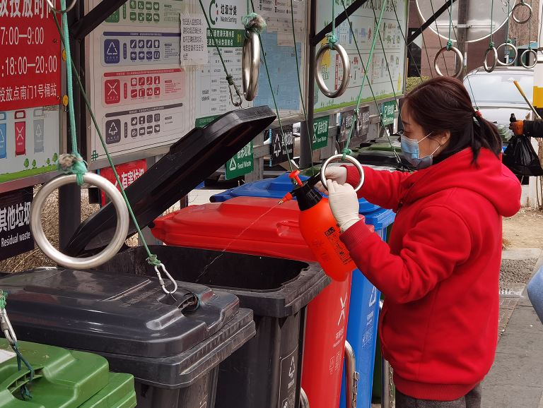 记者在城南街道世涛天朗社区看到,居民在疫情防控工作人员的指引下,有序进行扫码、测温。社区保洁员对居民日常接触较多的垃圾桶站及楼门进行细致消杀。