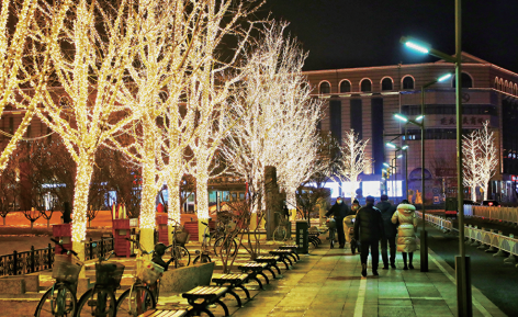 一路长灯莹彩将妫川大地装饰得活泼灵动,冬奥冰雪元素景观随处可见,让沐浴在霓虹中的城市神采飞扬,迎冬奥、贺新春,一处处融合着 “国际范”和“中国风”的夜景装饰点亮最美冬奥城。 夜色里,蓝白两色的雪花造型灯饰缀满枝头;悬挂在树枝上绚烂的灯带不断闪烁火树银花;火红的灯笼悬挂在道路两侧鲜艳夺目……冬奥冰雪元素、新春佳节元素一一呈现,以崭新姿态迎接北京2022年冬奥会的到来。