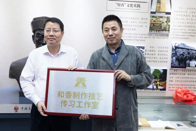 向中国香文化研究中心主任孙亮颁发“和香制作技艺传习工作室”牌匾。